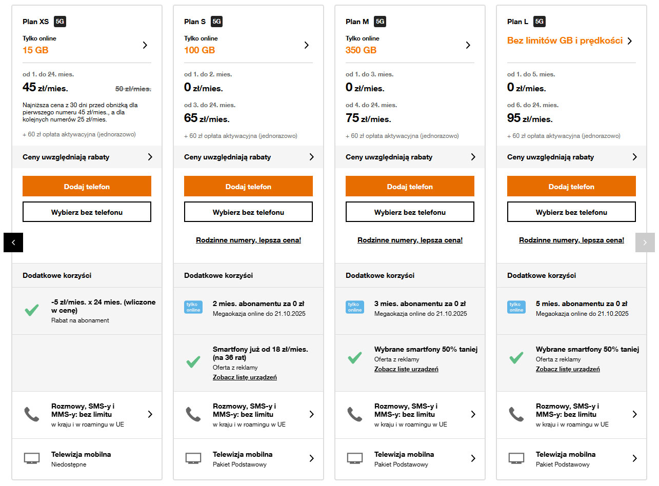 Ceny Planów XS, S, M, L uwzględniają rabat dla użytkowników Mój Orange za e-fakturę, odbierany co miesiąc w Mój Orange (-5 zł/mies.).