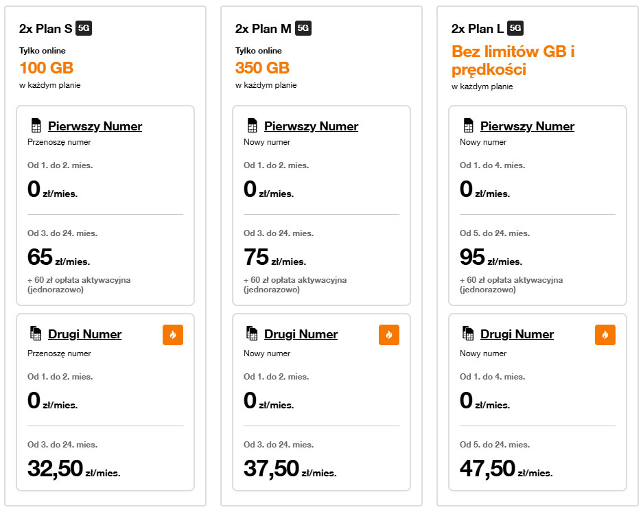 Każdy z planów obejmuje nielimitowane rozmowy, SMS-y i MMS-y, a także dostęp do sieci 5G. Umowa zawierana jest na 24 miesiące, a koszt aktywacji numeru wynosi 60 zł.