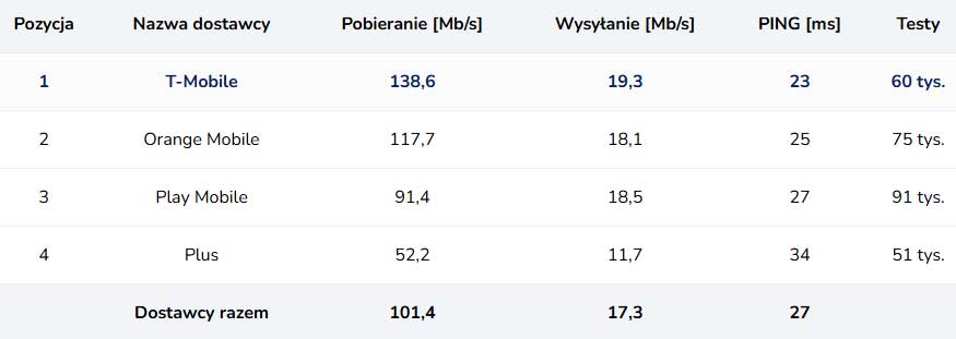 W rankingu internetu mobilnego T-Mobile ponownie utrzymał pozycję lidera, którą zajmuje nieprzerwanie od września 2024 r. Średnia prędkość pobierania wzrosła do 138,6 Mb/s z 133,0 Mb/s miesiąc wcześniej. Orange znów znalazł się na drugim miejscu, notując niewielką poprawę z 109,2 Mb/s do 117,7 Mb/s.