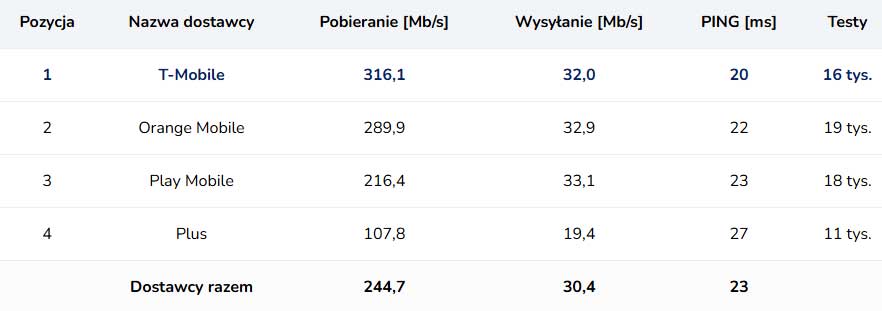 Bez większych zmian wygląda też zestawienie dla 5G. T-Mobile pozostał na czele, a jego średnia prędkość pobierania lekko wzrosła z 311,1 Mb/s do 316,1 Mb/s. Orange utrzymał drugą lokatę, poprawiając wynik z 280,6 Mb/s do 289,9 Mb/s. Play nadal jest trzeci, tym razem z drobnym spadkiem — z 218,8 Mb/s do 216,4 Mb/s.