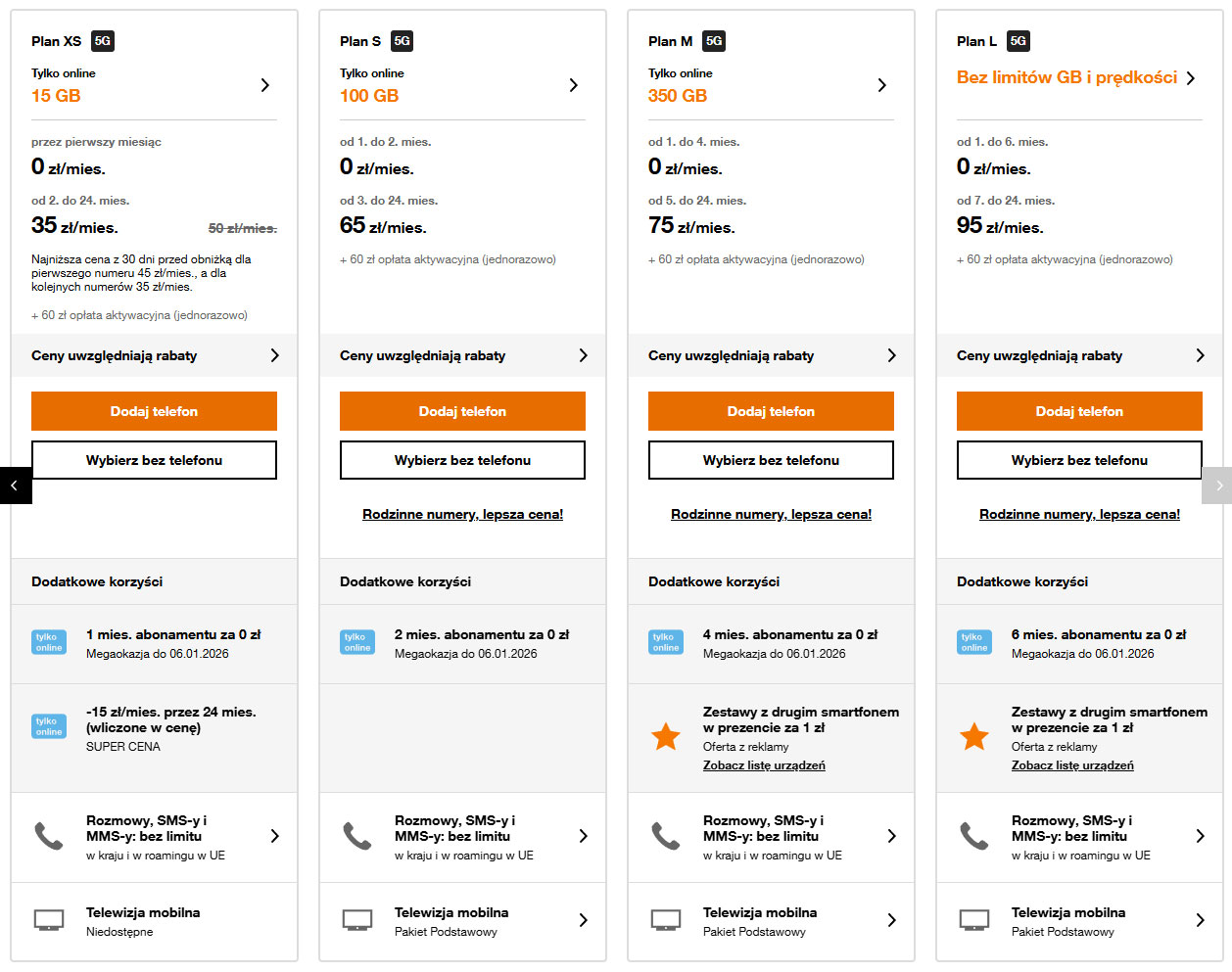 Każdy plan obejmuje nielimitowane rozmowy, SMS-y i MMS-y, a także dostęp do 5G. Umowa jest zawierana na 24 miesiące, a opłata aktywacyjna wynosi 60 zł.