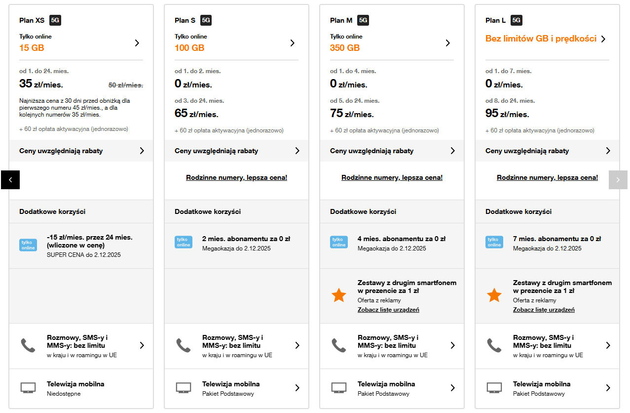 Każdy plan obejmuje nielimitowane rozmowy, SMS-y, MMS-y oraz 5G. Umowa na 24 miesiące, opłata aktywacyjna wynosi 60 zł.