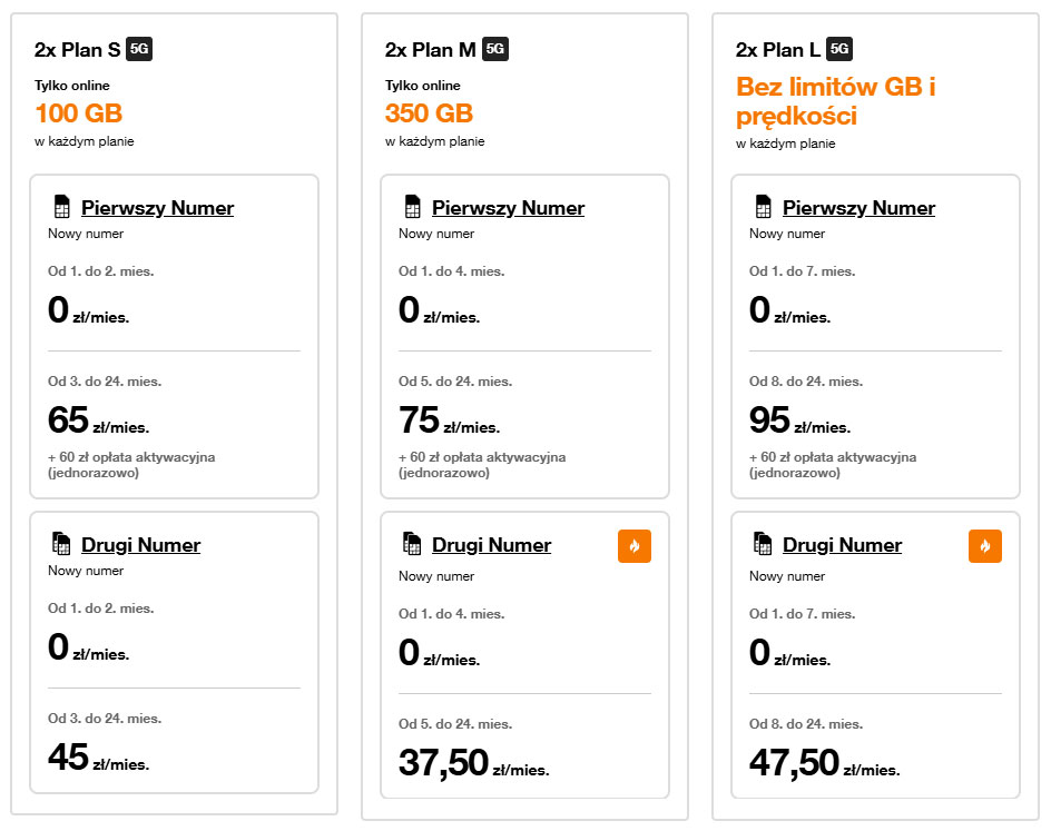 Orange oferuje również pakiety z dwoma abonamentami, naliczając 50% rabatu na drugi plan. W przykładowych konfiguracjach para Planów S to miesięcznie 65 zł za pierwszy numer i 45 zł za drugi. Dwa Plany M to 75 zł za pierwszy i 37,50 zł za drugi, natomiast dwa Plany L to odpowiednio 95 zł i 47,50 zł miesięcznie.
