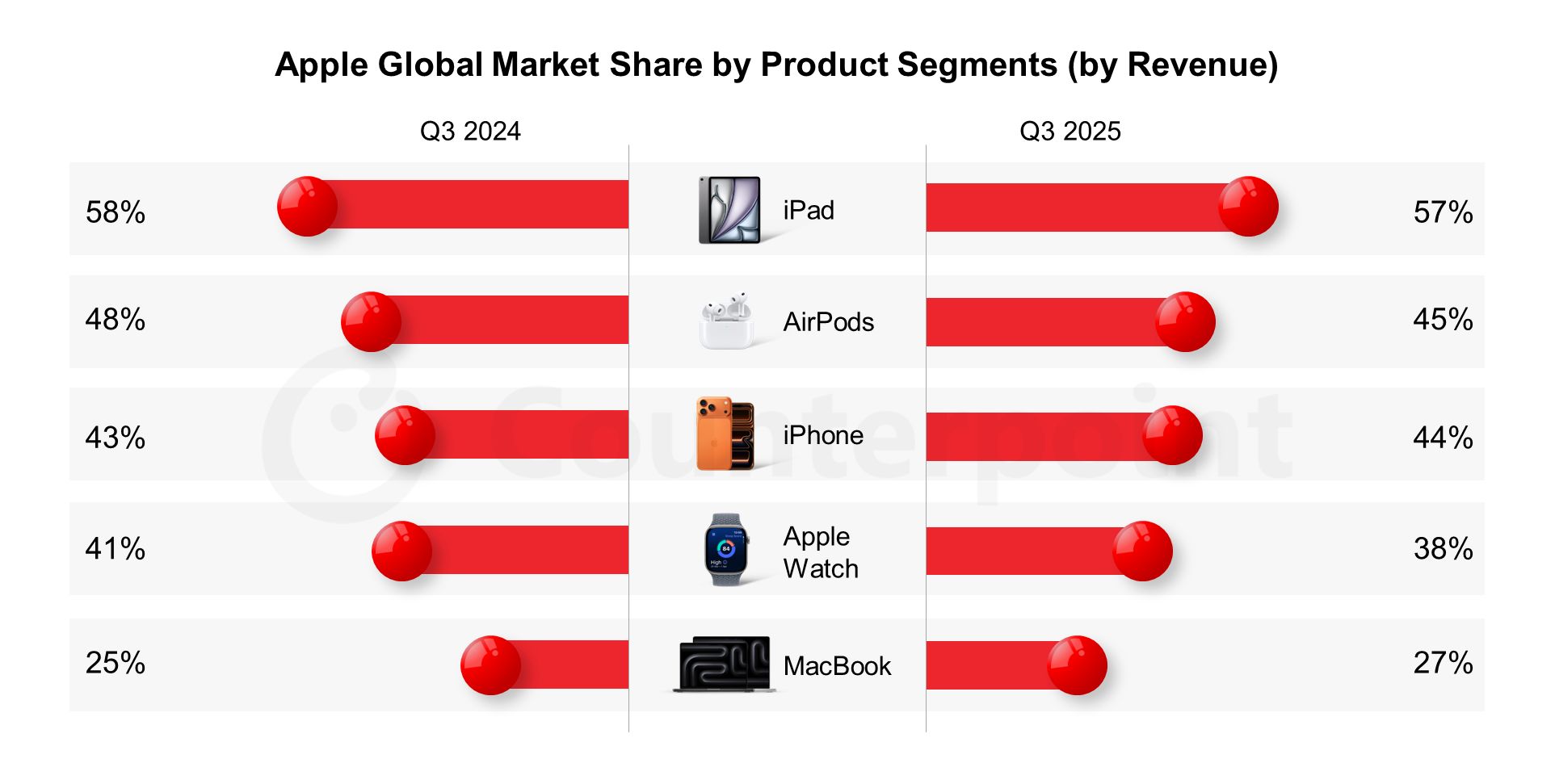 W segmencie słuchawek bezprzewodowych AirPods udział Apple spadł z 48 do 45 procent rok do roku, jednak firma nadal kontroluje niemal połowę globalnych przychodów w tej kategorii.