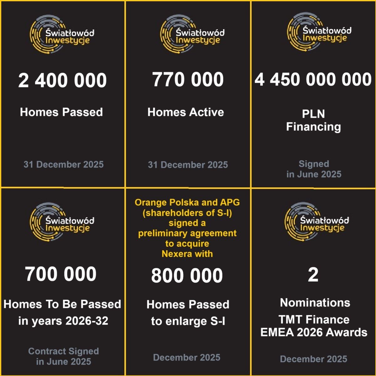Orange Polska i APG, jako akcjonariusze Światłowód Inwestycje, podpisali w grudniu 2025 r. wstępne porozumienie dotyczące przejęcia Nexery, a po uzyskaniu zgód regulacyjnych do sieci SI dołączy 800 tys. gospodarstw domowych w zasięgu tej infrastruktury.