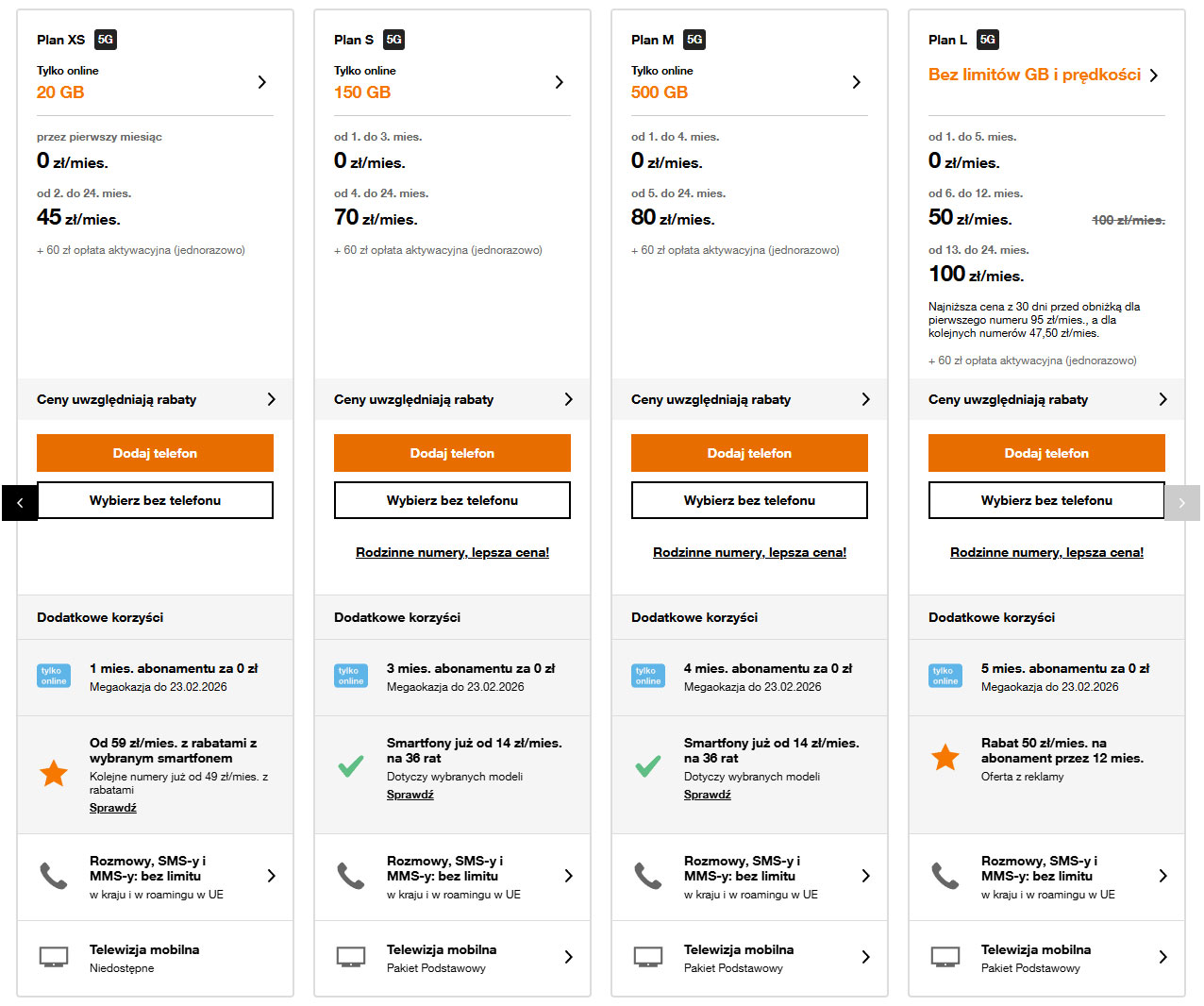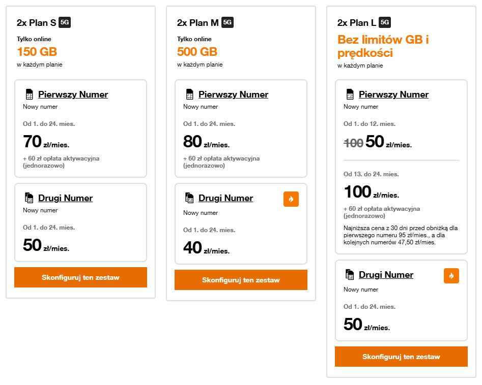 Najdroższy w portfolio Plan L nadal kosztuje 50 zł miesięcznie przez pierwszy rok trwania umowy. Po 12 miesiącach cena wraca do standardowego poziomu 100 zł miesięcznie. Wszystkie taryfy w ofercie Orange obejmują nielimitowane rozmowy, SMS-y, MMS-y oraz dostęp do 5G. Różnice dotyczą pakietu internetu: