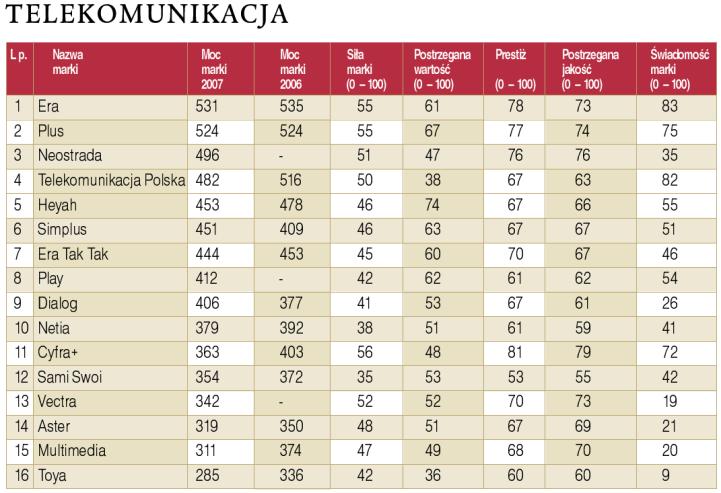 W tegorocznej piątej edycji Rankingu Najcenniejszych Polskich Marek dziennika Rzeczpospolita w kategorii Telekomunikacja pod względem "mocy marki" zwyciężyła marka Era. Marka Orange nie była uwzględniona w rankingu. Pełne zestawienie ze względu na "moc" marek telekomunikacyjnych znajduje się tutaj