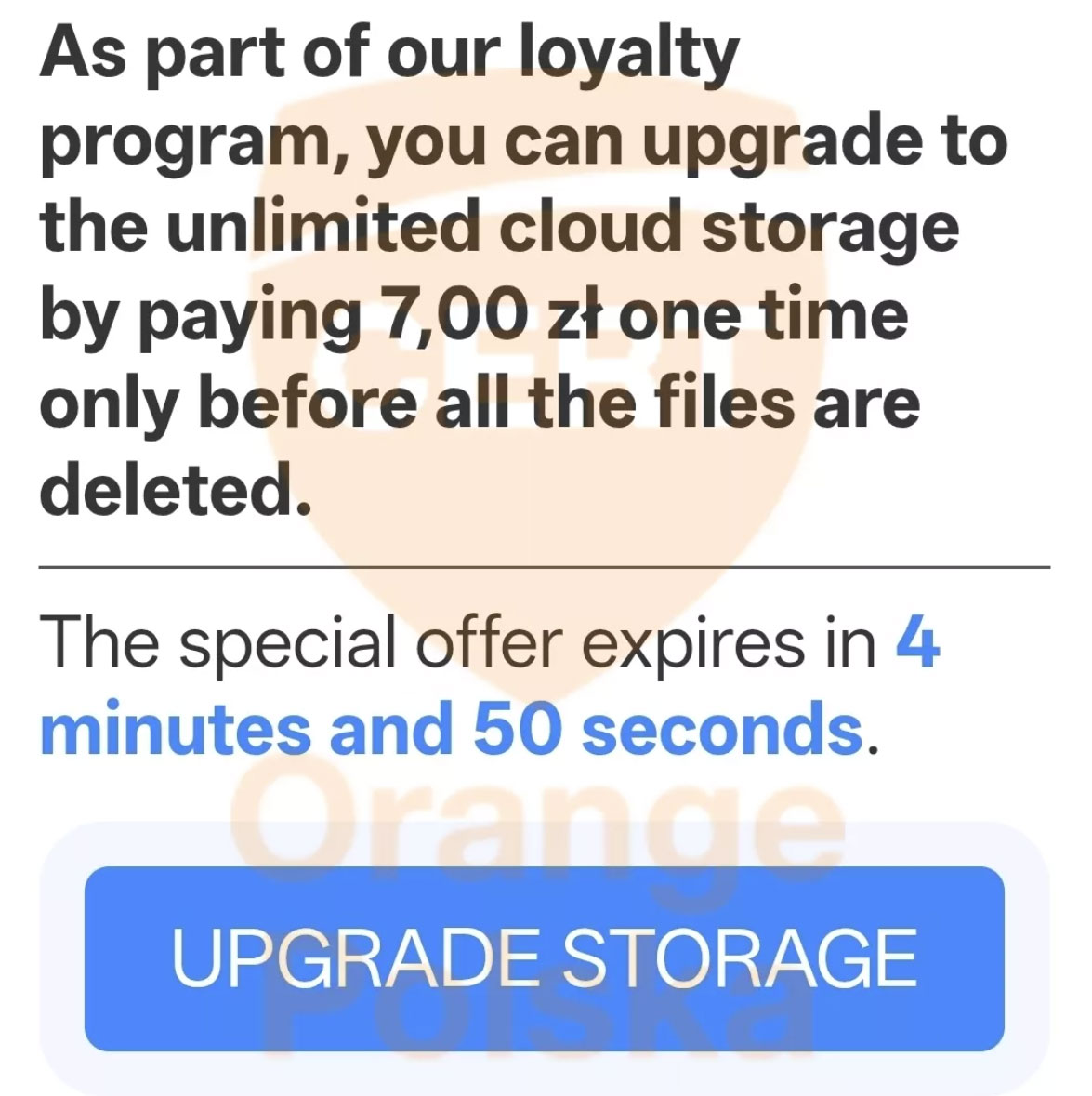 Drugi wariant jest już typowym oszustwem. Od początku użytkownik porusza się po infrastrukturze przestępców, kuszony „wyjątkową ofertą lojalnościową”. Pada obietnica „nieskończonej” przestrzeni za 7 zł, a decyzję trzeba podjąć w kilka minut, co ma wywołać presję i ograniczyć czas na zastanowienie. Kliknięcie w przycisk typu „upgrade storage” prowadzi do formularza, w którym ofiara podaje dane karty płatniczej — i w tym przypadku o zwrocie pieniędzy zwykle nie ma mowy.