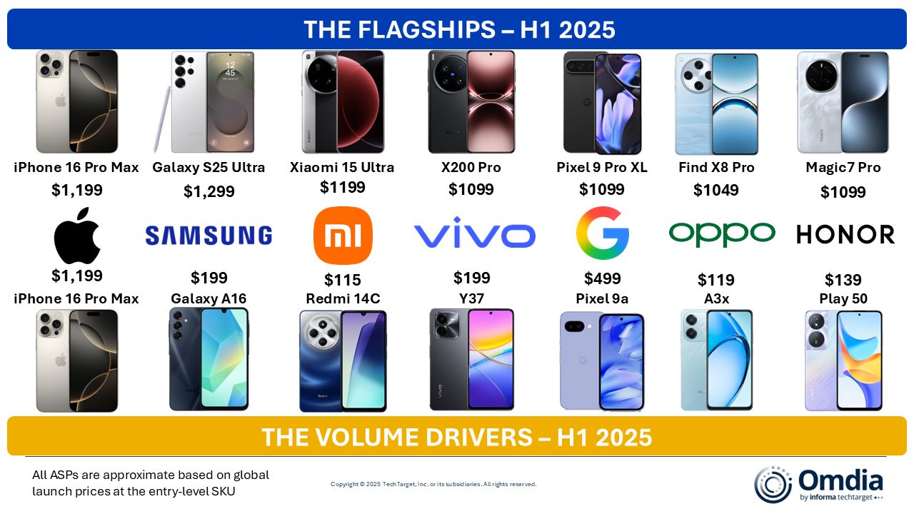Według danych Omdia za pierwsze półrocze 2025 roku najwięksi producenci smartfonów skupiali uwagę opinii publicznej na flagowcach – od iPhone’a 16 Pro Max i Galaxy S25 Ultra po Xiaomi 15 Ultra, Vivo X200 Pro czy Google Pixel 9 Pro XL. Ceny tych urządzeń oscylują wokół 1100–1300 dolarów, a ich zadaniem jest podkreślenie innowacyjności i budowanie prestiżu marek. Jednak to nie one odpowiadają za największe wolumeny sprzedaży.