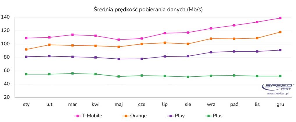 W prędkości pobierania ponownie wygrał T-Mobile, osiągając średnio 118,4 Mb/s, co oznacza wzrost o 40% rok do roku. Orange poprawił wynik jeszcze mocniej – o 44% – i przyspieszył do 102,4 Mb/s. Trzeci był Play z 83,4 Mb/s (+26% r/r). Jedyny spadek w „wielkiej czwórce” odnotował Plus, który obniżył średnią o 3% do 53,1 Mb/s.