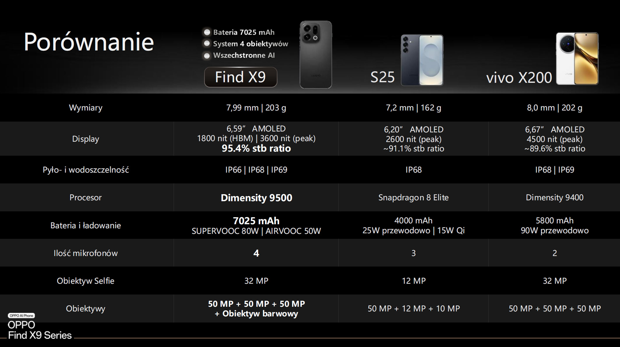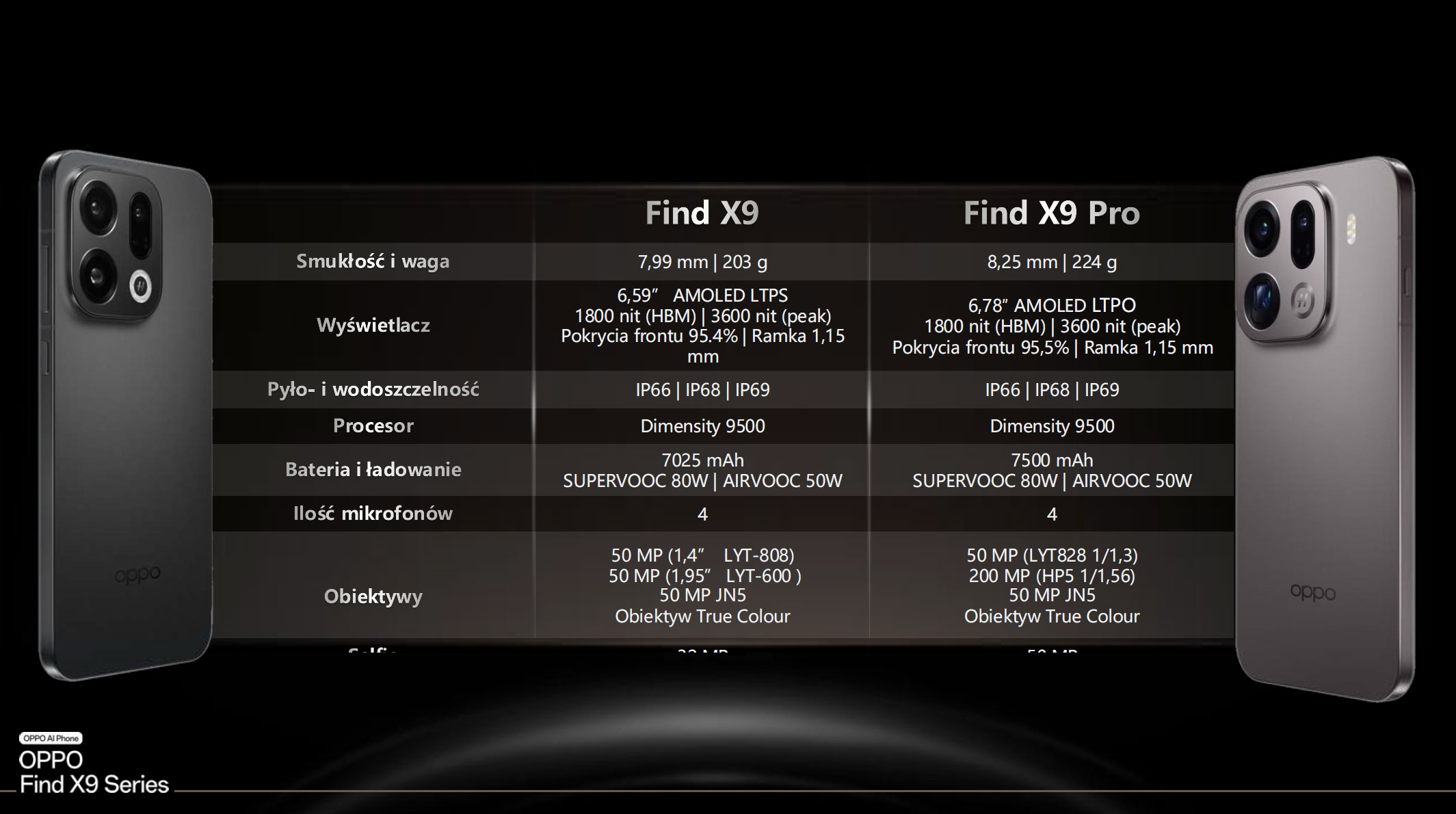 Find X9 ma zestaw 3×50 Mpix: główny f/1.6 z OIS, ultraszeroki 120° oraz tele 73 mm z OIS; z przodu 32 Mpix. W Find X9 Pro główny sensor 50 Mpix (f/1.5, OIS) i ultraszeroki 50 Mpix uzupełnia teleobiektyw 200 Mpix 70 mm z OIS, a selfie to 50 Mpix z AF. Obie wersje filmują w 4K do 120 kl./s, oferują 3× zoom optyczny i do 120× cyfrowego.