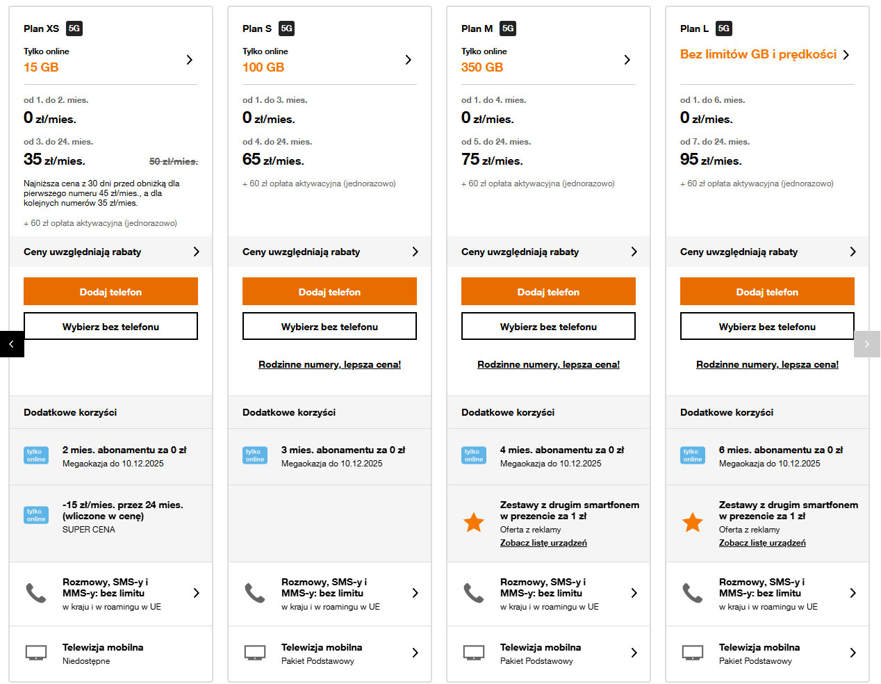 Wszystkie plany zawierają nielimitowane rozmowy, SMS-y, MMS-y oraz 5G. Umowa zawierana jest na 24 miesiące, a opłata aktywacyjna wynosi 60 zł.