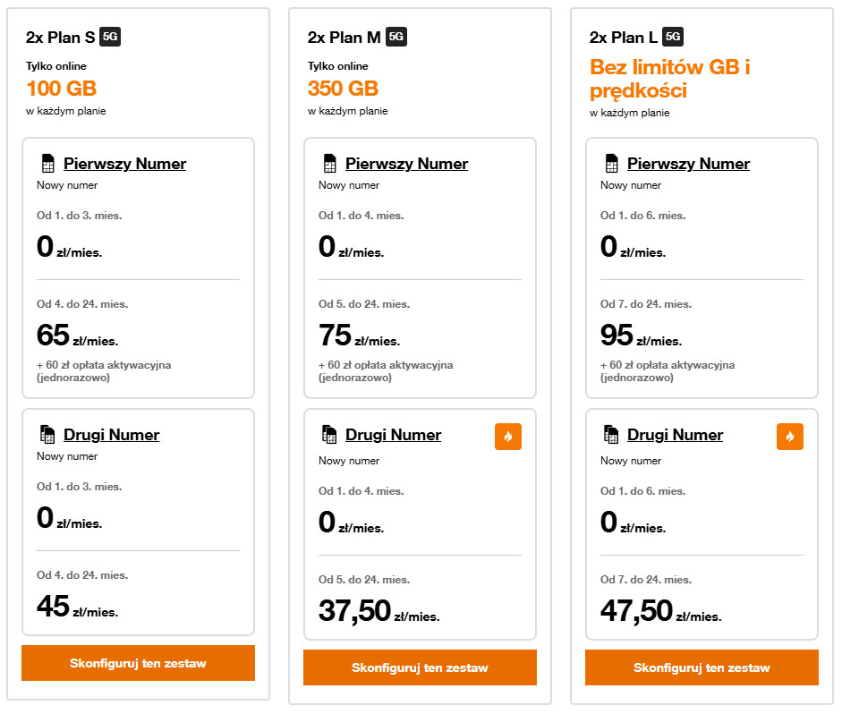 Orange nadal oferuje pakiety z dwoma abonamentami M i L – drugi plan jest tańszy o 50%. W przypadku pary Planów S oszczędność wynosi 20 zł miesięcznie. Przykładowe konfiguracje: