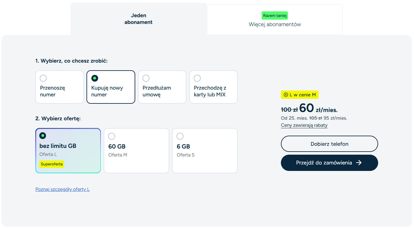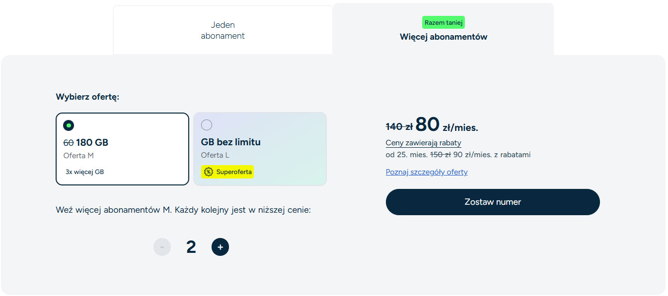 Operator utrzymał też mechanizm rabatów dla klientów decydujących się na więcej niż jeden numer. W praktyce oznacza to, że przy dwóch abonamentach miesięczny koszt może spaść, a jednocześnie rośnie dostępny pakiet danych. Na przykład wybierając dwa numery z opcją M, zapłacimy 80 zł/mies. i dodatkowo otrzymamy większy pakiet danych – 180 GB/mies. dla każdego numeru.