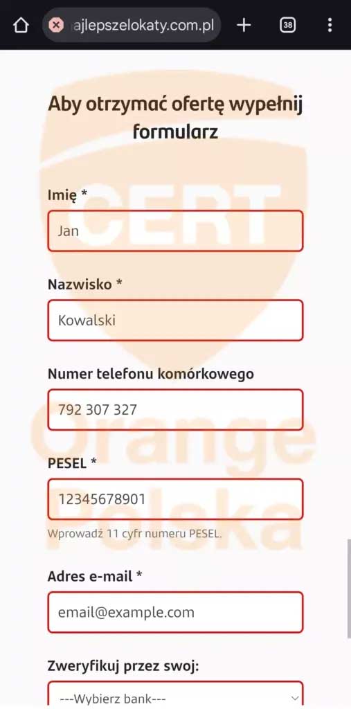 Po kliknięciu w reklamę użytkownik trafiał na formularz, w którym proszono o podanie szeregu danych osobowych: imienia, nazwiska, numeru telefonu, adresu e-mail, a także numeru PESEL. Już taki zestaw informacji stanowi dla przestępców cenny materiał do dalszych nadużyć. To jednak dopiero wstęp do właściwego ataku.