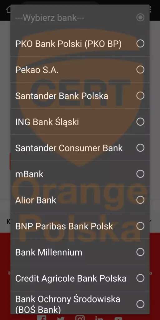 Kolejny etap polegał na wybraniu banku, z którego korzysta potencjalna ofiara. Po dokonaniu wyboru użytkownik był przekierowywany do strony łudząco przypominającej serwis transakcyjny danego banku. W rzeczywistości była to fałszywa nakładka przygotowana przez cyberprzestępców. Wprowadzenie tam loginu i hasła oznaczało przekazanie im pełnego dostępu do rachunku.
