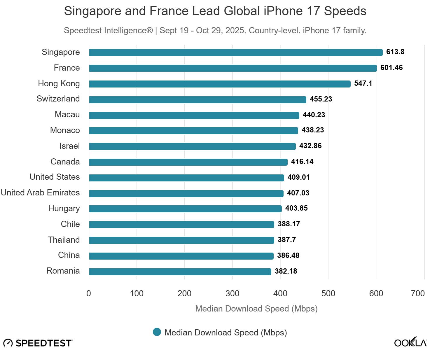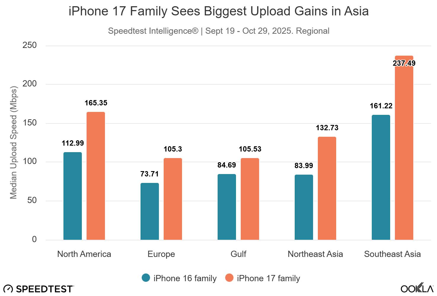 Na poziomie regionalnym użytkownicy iPhone'a 17 cieszyli się najwyższą średnią prędkością pobierania w Ameryce Północnej, wynoszącą 416,14 Mb/s (wzrost z 323,69 Mb/s w przypadku rodziny iPhone'ów 16), głównie dzięki większemu wykorzystaniu pasma 6 GHz. Na poziomie krajowym użytkownicy iPhone'a 17 w Singapurze (613,80 Mb/s) i Francji (601,46 Mb/s) odnotowali najwyższe prędkości spośród wszystkich rynków, na których wprowadzono to urządzenie, co odzwierciedla bardzo wysoką penetrację światłowodów wielogigabitowych w obu krajach.