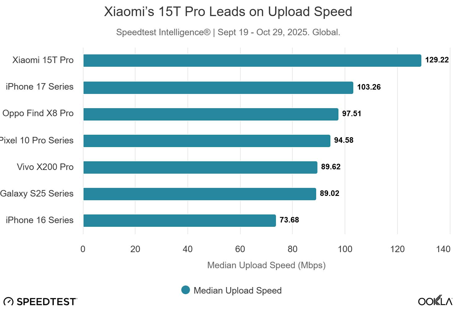 W okresie objętym badaniem urządzenie Xiaomi 15T Pro osiągnęło najszybsze prędkości wysyłania danych w Europie w każdym mierzonym percentylu (10., mediana, 90.), a także zajęło pierwsze miejsce pod względem wysyłania danych w 10. percentylu w Azji Północno-Wschodniej. Na rynkach bogatych w łącza światłowodowe, takich jak Francja, które charakteryzują się bardzo wysoką wydajnością wysyłania danych i symetrycznymi prędkościami łączy, model 15T Pro był jedynym urządzeniem, które przekroczyło 100 Mb/s w 10. percentylu, 500 Mb/s w medianie i 1000 Mb/s w 90. percentylu.