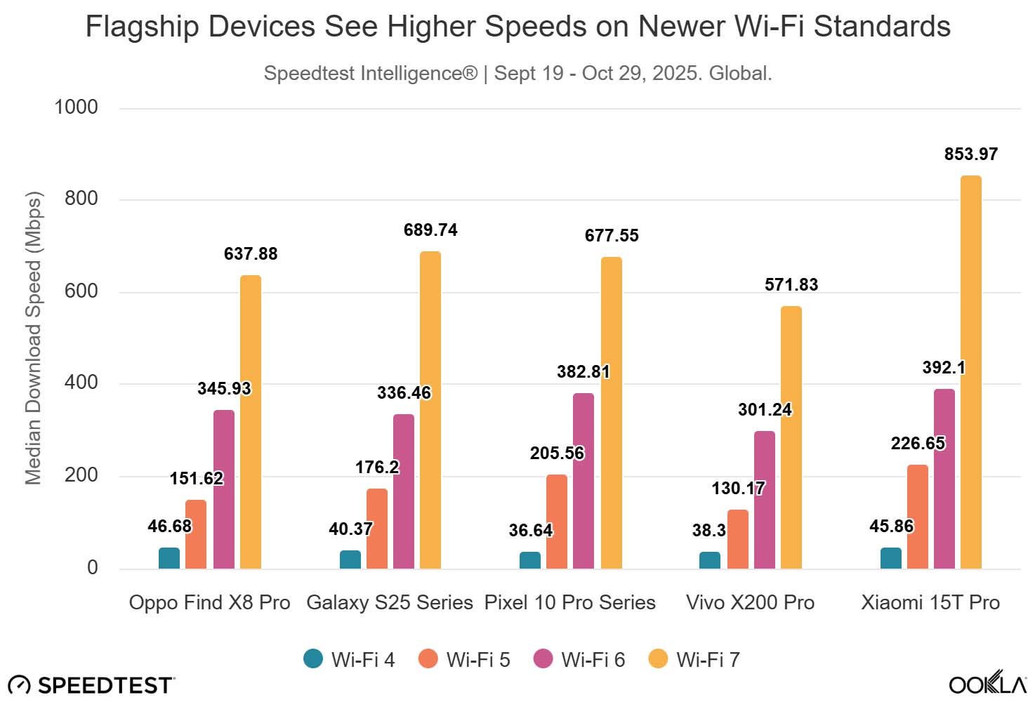 Te ulepszenia przekładają się na wymierne korzyści, ponieważ Wi-Fi 7 zapewnia około dwukrotnie większą średnią prędkość pobierania niż Wi-Fi 6 na tych samych flagowych urządzeniach z systemem Android objętych badaniem (wzrost od +74% do +108% w zależności od rodziny urządzeń). Przejście z Wi-Fi 5 na Wi-Fi 6 zapewniło podobny wzrost na tych urządzeniach (wzrost od +72% do +123%). Podobnie średnia prędkość pobierania na flagowych urządzeniach podłączonych do sieci 6 GHz była co najmniej o 77% większa niż w przypadku sieci 5 GHz.