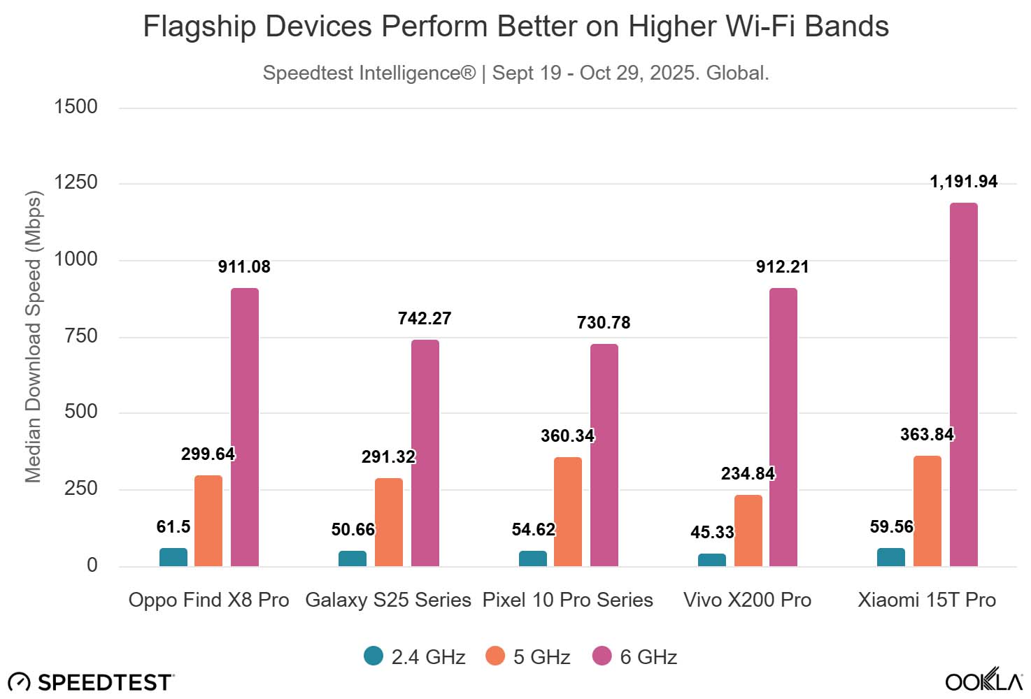 Oprócz rodziny iPhone'ów 17, Pixel 10 Pro również osiągnął dobre wyniki pod względem prędkości pobierania. Prawdopodobnie wyposażony w układ Wi-Fi firmy Broadcom (zgodnie z linią Pixel 8 i 9), osiągnął najwyższą średnią prędkość pobierania na świecie wynoszącą 335,33 Mb/s w okresie badania, nieznacznie wyprzedzając rodzinę iPhone'ów 17, która osiągnęła prędkość 329,56 Mb/s. Na rynkach takich jak Ameryka Północna, gdzie chińskie marki z systemem Android mają ograniczony udział, Pixel 10 Pro prowadzi również pod względem wydajności wysyłania danych, zarówno w medianie, jak i 90. percentylu.