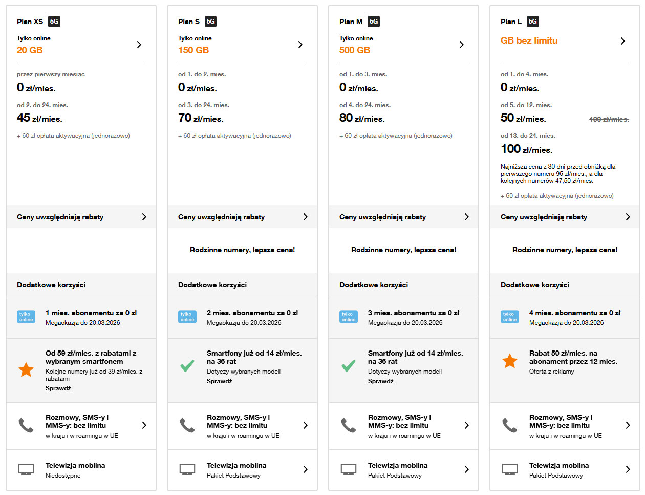 Wszystkie taryfy obejmują nielimitowane rozmowy, SMS-y i MMS-y w kraju oraz dostęp do sieci 5G. Różnice pomiędzy planami dotyczą przede wszystkim pakietów internetu mobilnego.