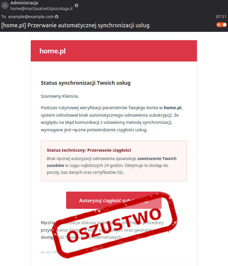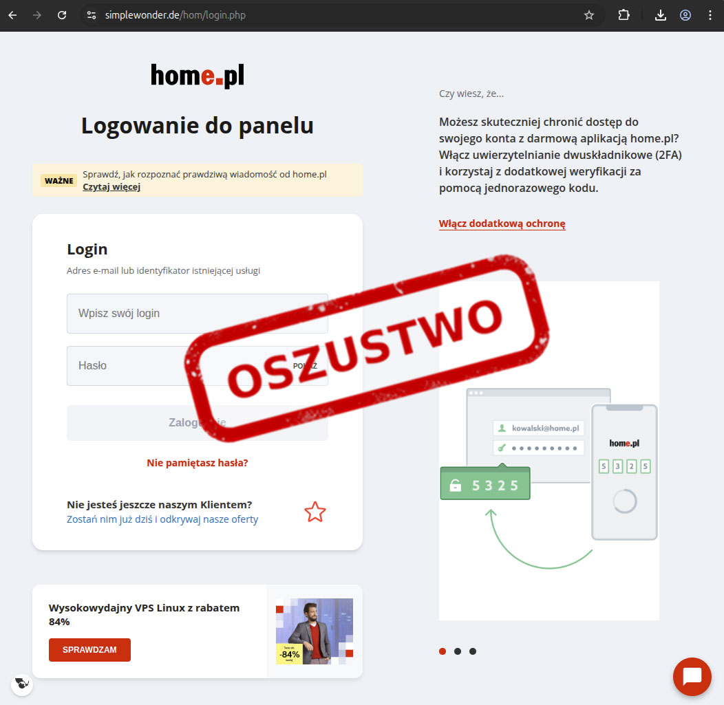 CERT Polska ostrzega przed kampanią phishingową, w której przestępcy wykorzystują wizerunek firmy home.pl.