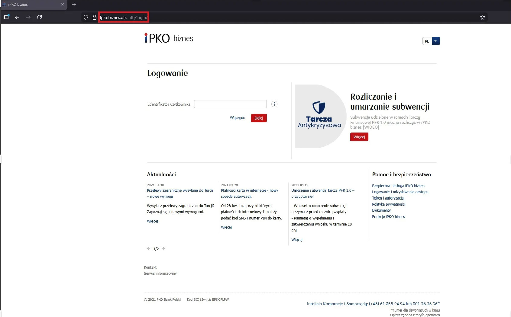 PKO BP ostrzega przed nową falą ataków na klientów korzystających z serwisu iPKO biznes. Przestępcy podszywają się pod bank i przekierowują użytkowników na fałszywe strony logowania, których celem jest wyłudzenie danych dostępowych do systemu transakcyjnego.