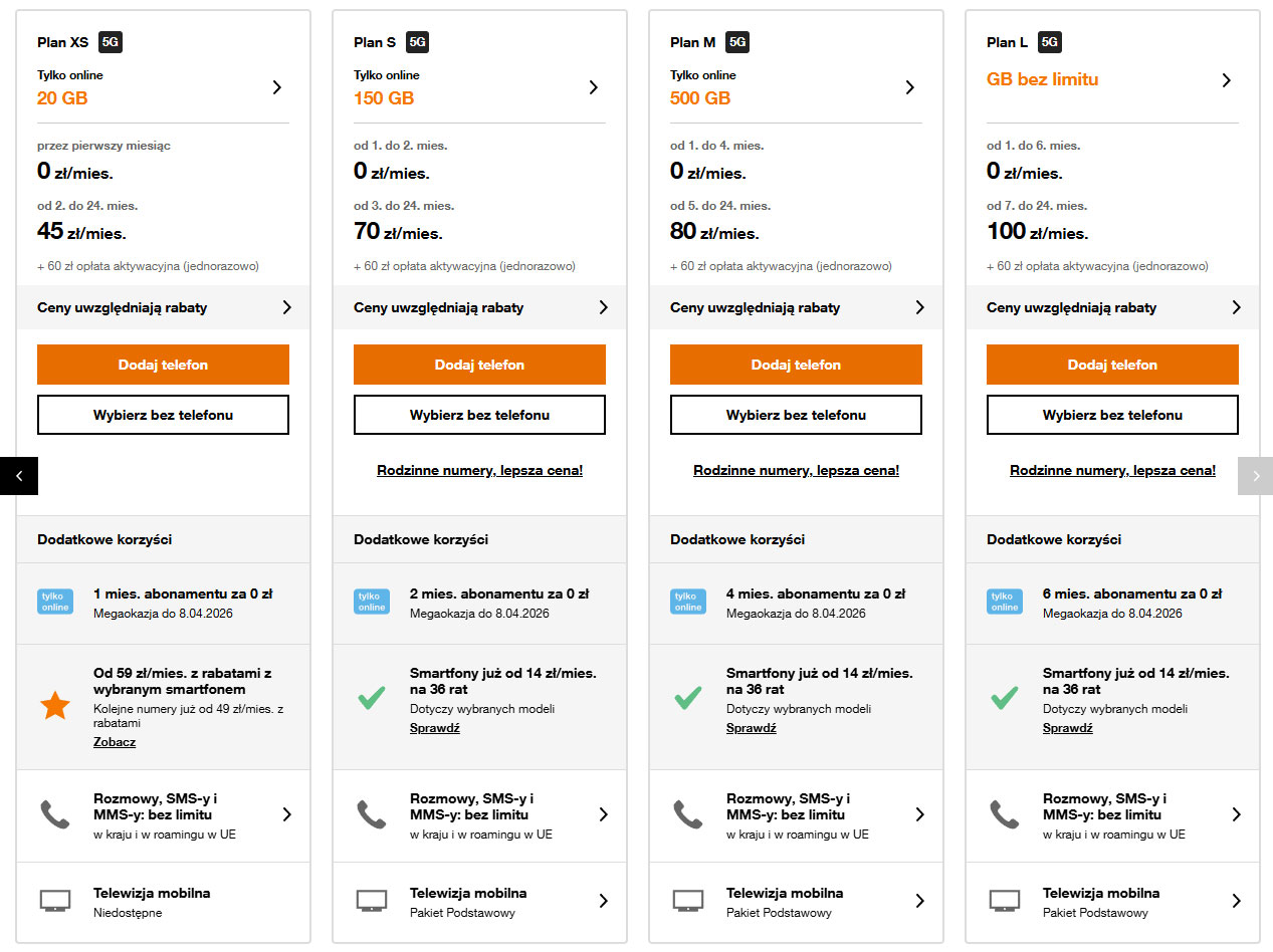 Same taryfy pozostają bez zmian. Każdy plan oferuje nielimitowane rozmowy, SMS-y i MMS-y w kraju oraz dostęp do sieci 5G. W najtańszym XS za 45 zł miesięcznie użytkownik dostaje 15 GB (lub 20 GB przy zakupie online), Plan S za 70 zł zapewnia 100 GB, które online rośnie do 150 GB. W M za 80 zł do dyspozycji jest 400 GB (500 GB online), a w L za 100 zł klient otrzymuje nielimitowany internet bez ograniczeń prędkości.