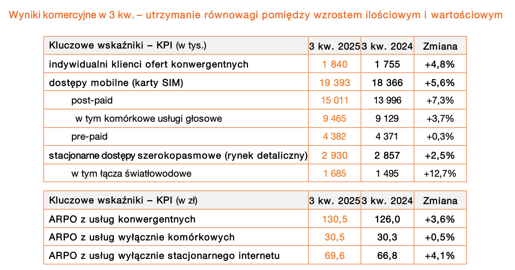 Wskaźnik ARPO z usług wyłącznie stacjonarnego internetu wzrósł w ujęciu rocznym o 4,1%, do poziomu 69,6 zł, dzięki strategii nastawionej na wartość oraz rosnącemu udziałowi klientów usług światłowodowych (które w porównaniu z innymi technologiami generują wyższy średni przychód na ofertę).