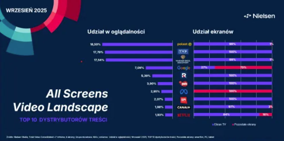 Telewizor jest głównym ekranem oglądania dla: Google – 27% użytkowników, Netflixa – 84%, Canal+ – 97% oraz Warner Bros. Discovery – 99%.