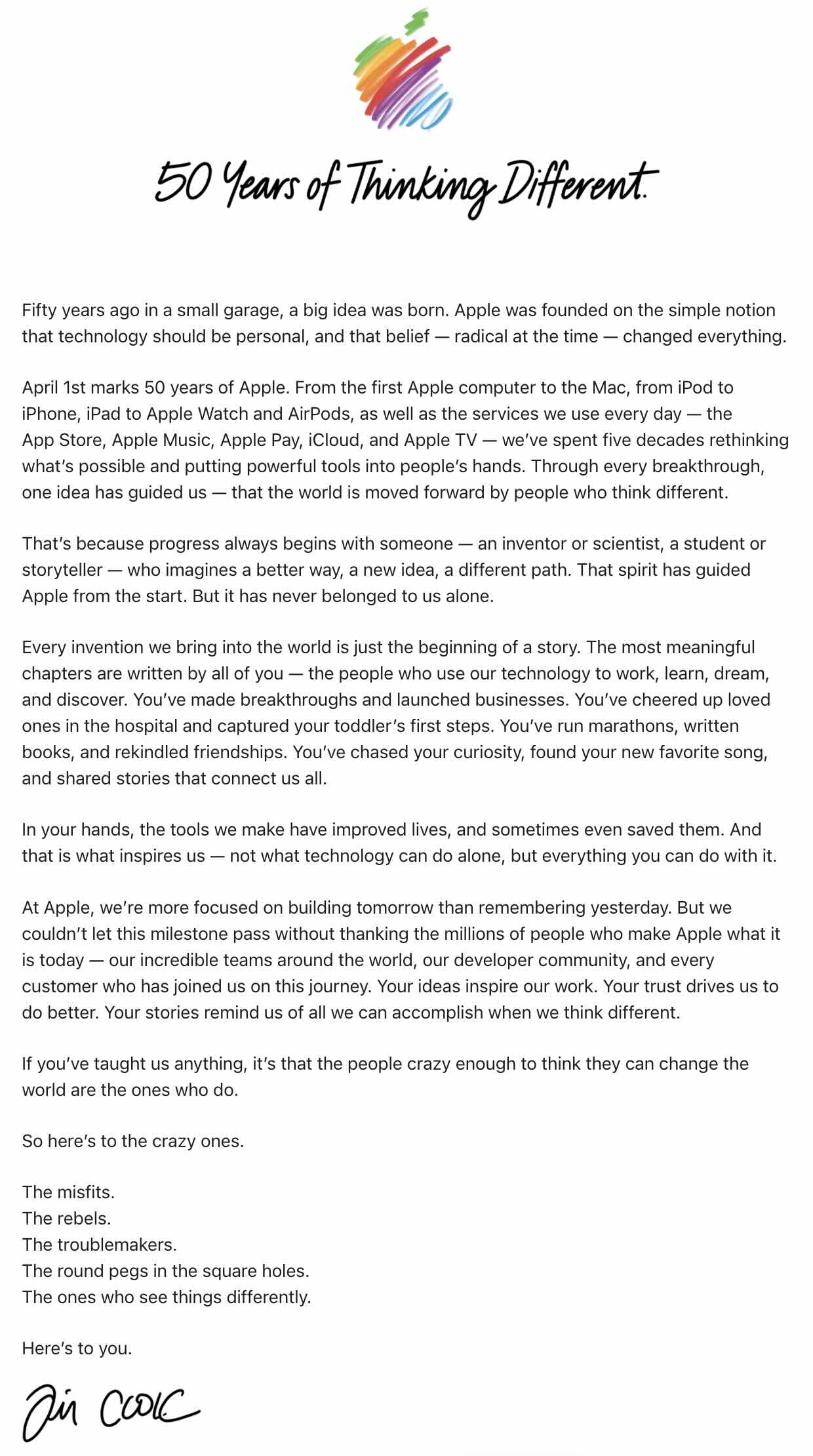 W Apple bardziej skupiamy się na budowaniu przyszłości niż na wspominaniu przeszłości. Nie mogliśmy jednak pozwolić, aby ten kamień milowy minął bez podziękowania milionom ludzi, którzy sprawili, że Apple jest tym, czym jest dzisiaj — naszym niesamowitym zespołom na całym świecie, naszej społeczności programistów i wszystkim klientom, którzy dołączyli do nas w tej podróży. Wasze pomysły inspirują naszą pracę. Wasze zaufanie motywuje nas do działania. Wasze historie przypominają nam o wszystkim, co możemy osiągnąć, gdy myślimy inaczej.