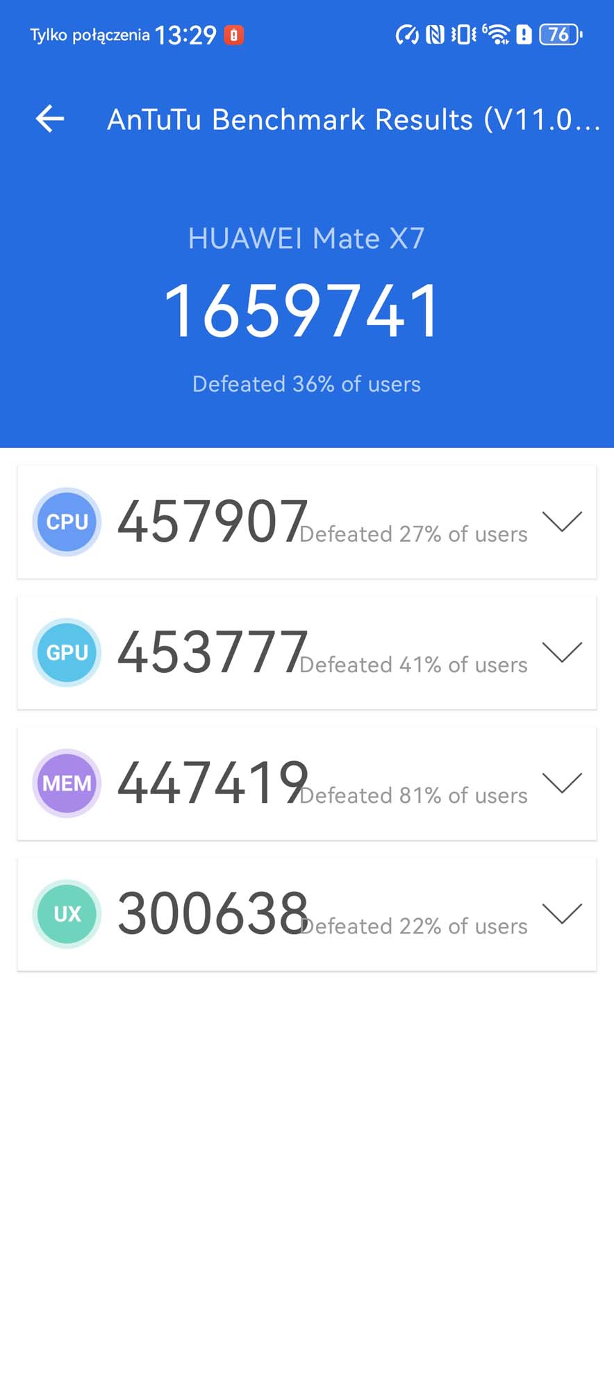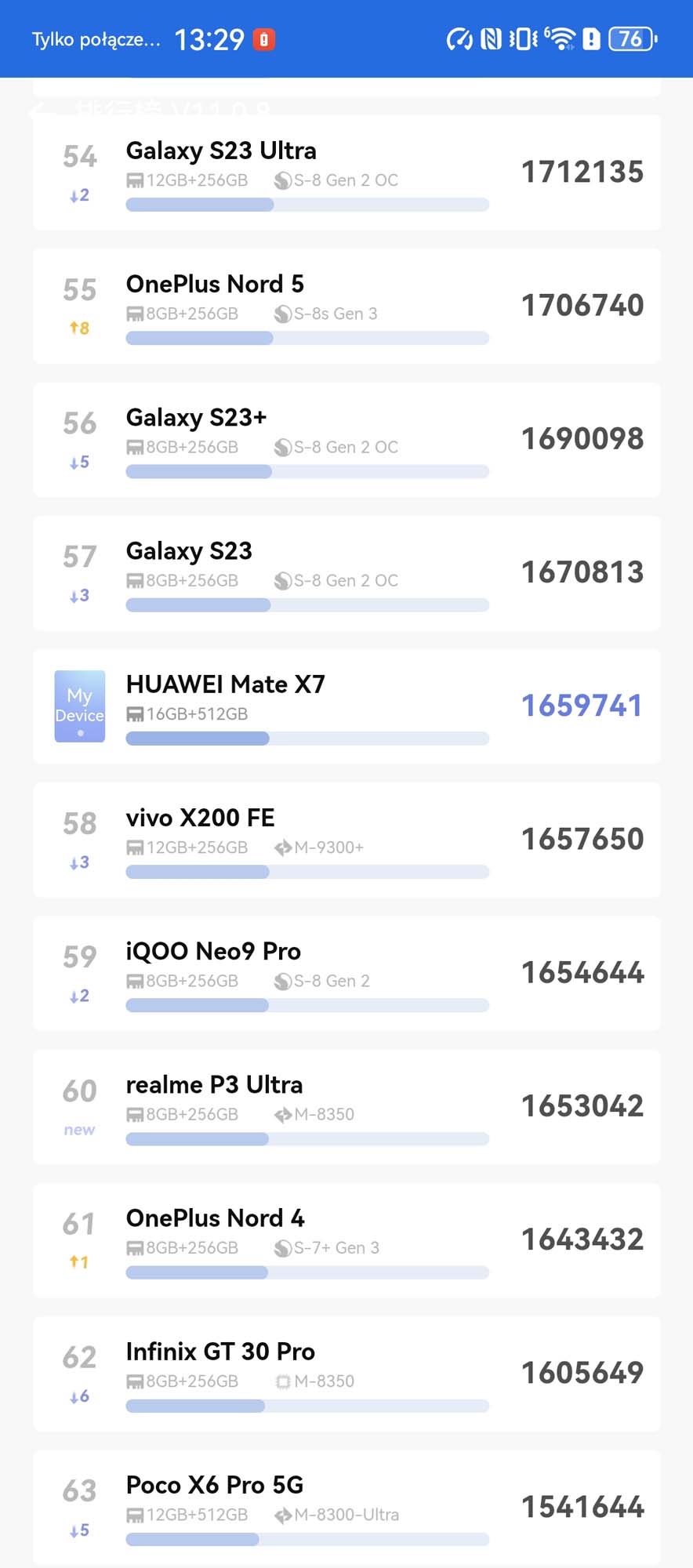 Sercem urządzenia jest procesor Kirin 9030, wykonany w procesie technologicznym 6 nm. Wspiera go 16 GB pamięci RAM oraz 512 GB pamięci wewnętrznej bez możliwości rozbudowy. W benchmarku AnTuTu Mate X7 osiąga wynik 1 659 741 punktów, co daje mu 58. miejsce w rankingu. Jest to wydajność na poziomie średniej półki, daleko za obecnymi flagowcami ze Snapdragonem 8 Elite. Choć w codziennym użytkowaniu, przy przeglądaniu sieci czy multimediach, telefon działa płynnie, to pod dużym obciążeniem procesor ma tendencję do mocnego nagrzewania się i throttlingu. Wydajność procesora przy dłuższym wysiłku potrafi znacząco spaść, co jest ceną za tak smukłą obudowę i mniej zaawansowany proces technologiczny.
