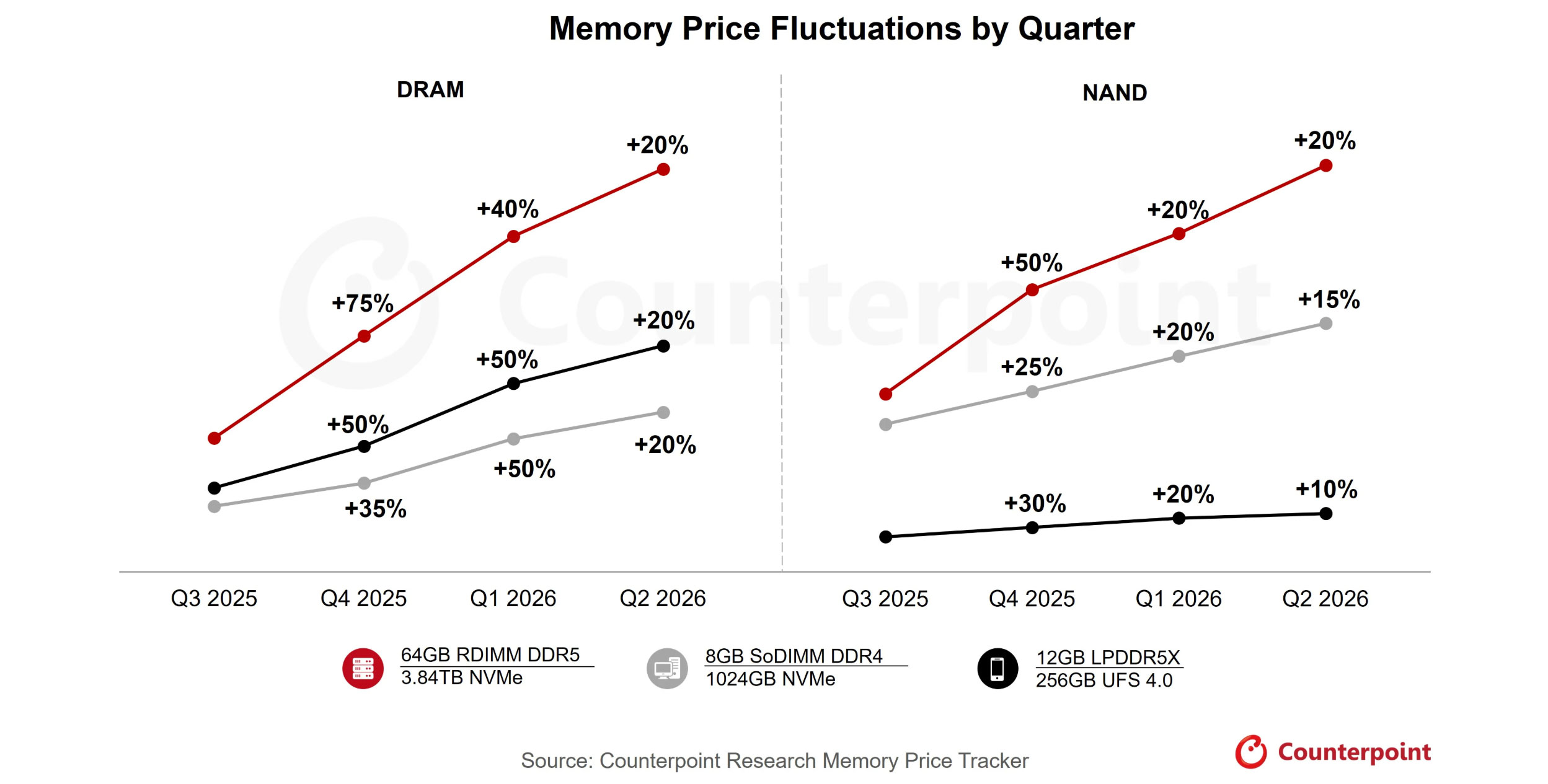 Counterpoint Research ocenia, że rynek pamięci wszedł w fazę, gdy popyt przewyższa podaż i nie da się tego szybko zrównoważyć zwiększeniem produkcji, a obecne warunki przewyższają szczyt z 2018 roku. Według firmy przewaga dostawców jest dziś wyjątkowo duża, bo popyt związany z AI i rozbudową infrastruktury serwerowej pozostaje bardzo wysoki. Analitycy oczekują, że po wzroście cen o 40 do 50 procent w IV kwartale 2025 roku, kolejne podwyżki rzędu 40 do 50 procent pojawią się w I kwartale 2026 roku, a w II kwartale 2026 roku wzrosty mogą wynieść około 20 procent.