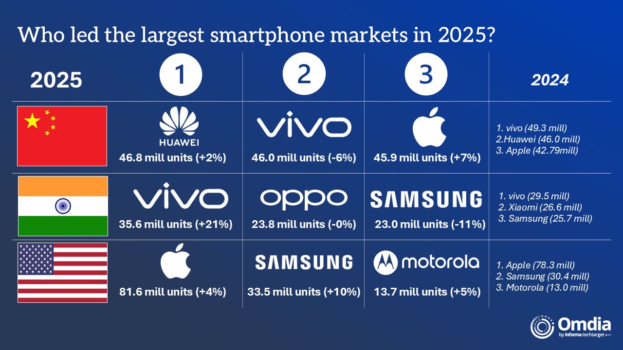 Najbardziej zacięta walka trwa w Chinach. To rynek bardzo konkurencyjny, gdzie sześciu producentów kontroluje ponad 90 proc. sprzedaży, a udziały każdego z nich mieszczą się w przedziale 13-17 proc. W 2025 roku na pozycję lidera wrócił Huawei, który po raz pierwszy od 2020 roku wyprzedził vivo i Apple. Z danych Omdia wynika, że Huawei sprzedał tam 46,8 mln smartfonów, co oznacza wzrost o 2 proc. rok do roku. vivo zajął drugie miejsce z wynikiem 46 mln sztuk i spadkiem o 6 proc., a Apple było trzecie z rezultatem 45,9 mln urządzeń i wzrostem o 7 proc. Kolejne miejsca zajęły Xiaomi, OPPO i HONOR. Mimo ostrej rywalizacji i niższych marż sprzętowych producenci mają mocne powody, by bronić pozycji właśnie w Chinach, bo lokalny rynek daje im szerokie możliwości zarabiania na usługach, oprogramowaniu i reklamie.