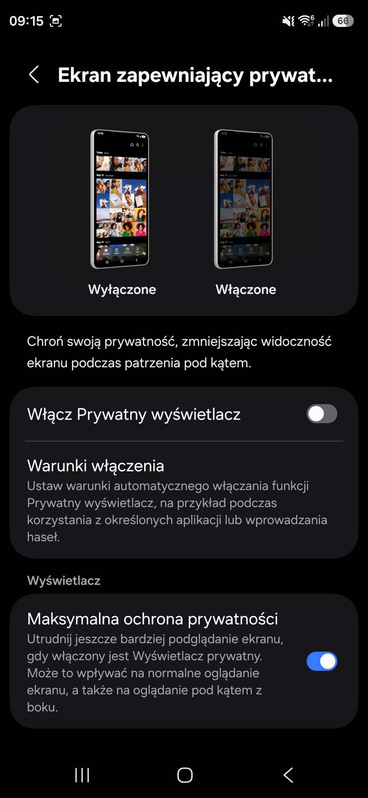 Wyróżnikiem S26 Ultra, niedostępnym u konkurencji ani w starszych urządzeniach Galaxy, jest funkcja Privacy Display. Jest to rozwiązanie sprzętowe, które na żądanie zawęża kąty widzenia ekranu poprzez zwiększoną polaryzację światła. Technologia ta chroni wyświetlane treści przed wzrokiem osób postronnych, oferując dwa poziomy skuteczności działania. Użytkownik ma możliwość aktywowania tej funkcji ręcznie dla całego ekranu lub ustawienia jej automatycznego działania tylko dla wybranych, wrażliwych fragmentów, na przykład powiadomień z komunikatorów, ekranu wpisywania kodu PIN czy aplikacji bankowych.