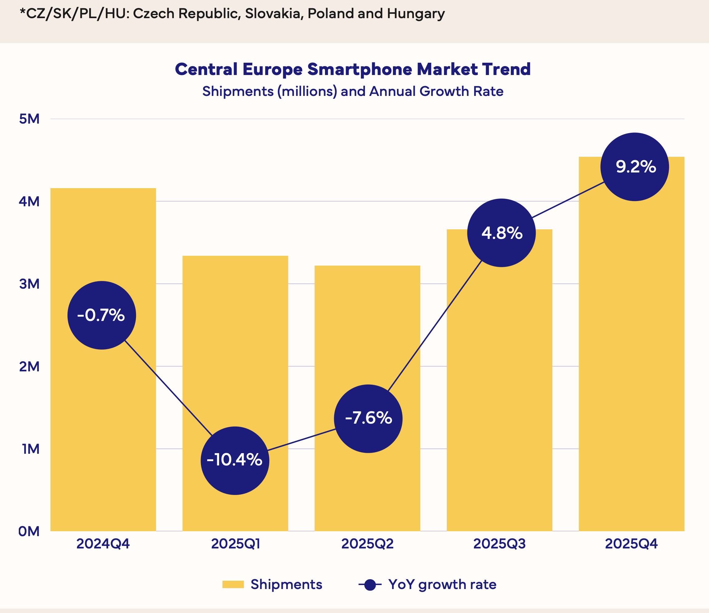 Rynek smartfonów w Europie Środkowej zakończył IV kw. 2025 r. wyraźnym wzrostem. Według danych IDC w Polsce, Czechach, Słowacji i na Węgrzech dostawy smartfonów wyniosły 4,5 mln sztuk, co oznacza wzrost o 9,2 proc. rok do roku. To najlepszy wynik w analizowanym okresie po słabszych kwartałach 2025 r., gdy rynek notował spadki lub niewielkie odbicie.