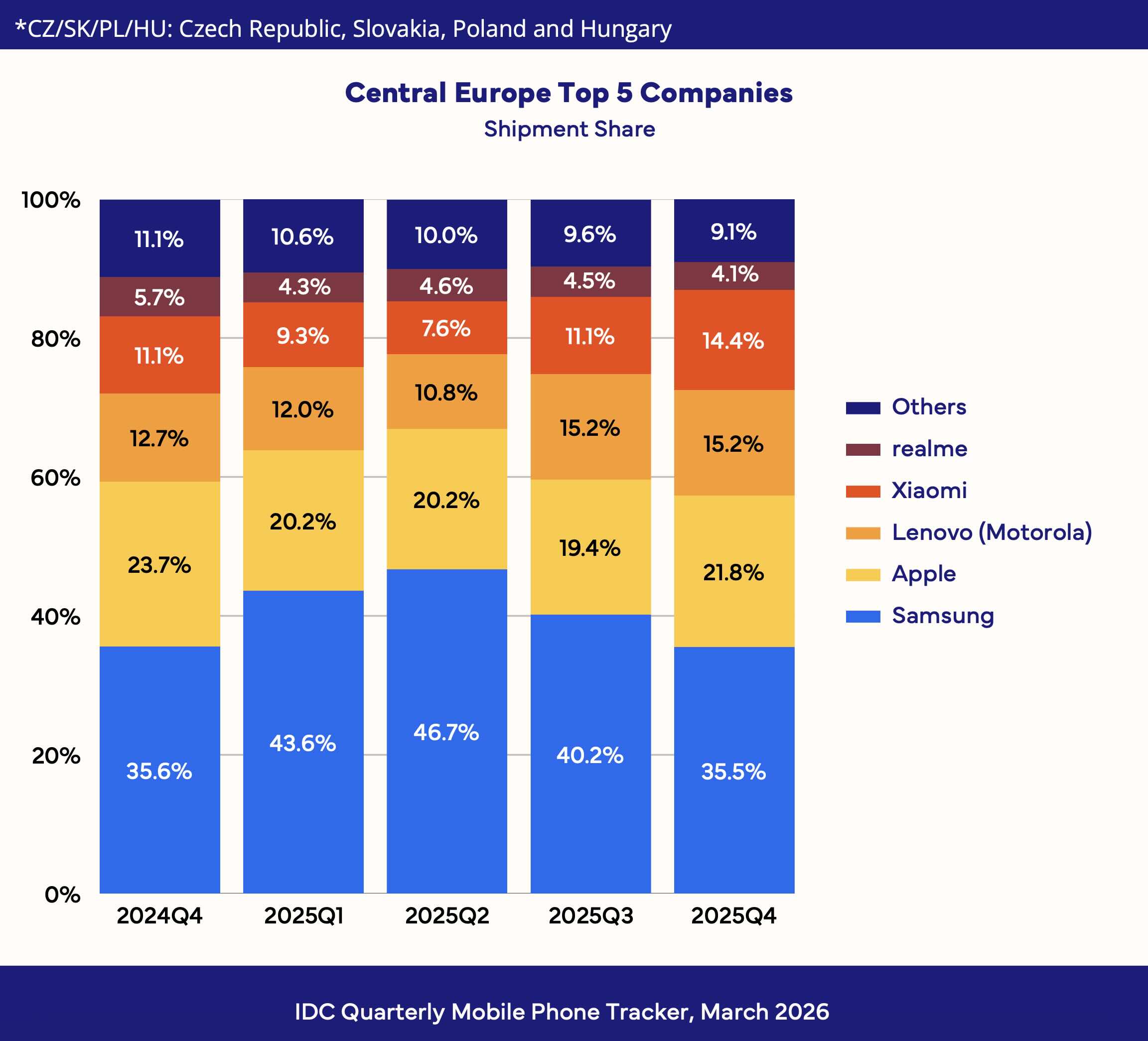 W całym regionie liderem pozostał Samsung. W IV kw. 2025 r. koreański producent miał 35,5 proc. udziału w dostawach. Drugie miejsce zajęło Apple z udziałem 21,8 proc., a trzecie Lenovo Motorola z wynikiem 15,2 proc. Xiaomi osiągnęło 14,4 proc., a realme 9,1 proc. Największą zmianą w porównaniu z wcześniejszymi kwartałami był mocniejszy wzrost Motoroli i Xiaomi, które poprawiły pozycję w segmentach bardziej wrażliwych cenowo.