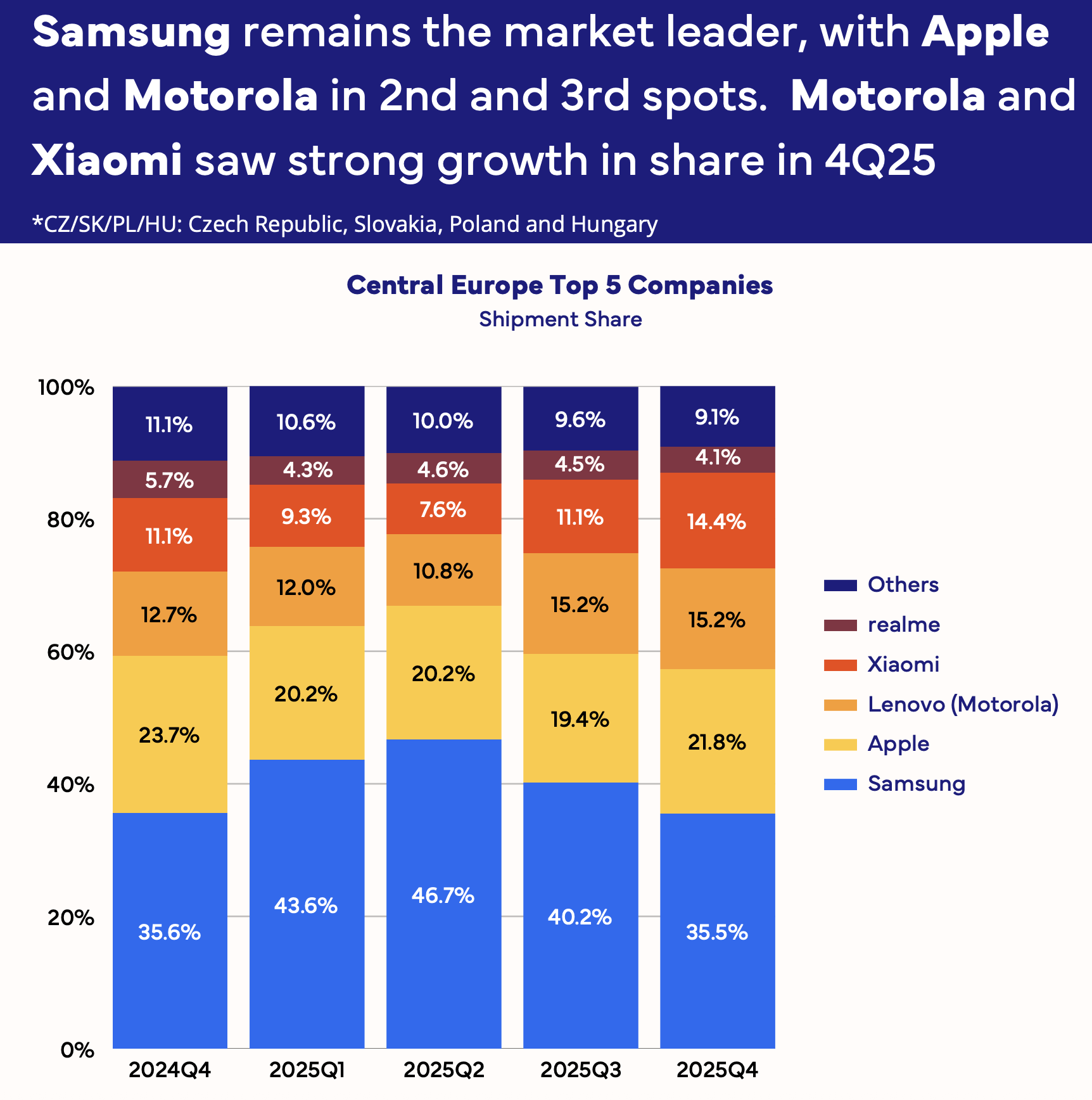 IDC ocenia, że rynek w Europie Środkowej jest dziś mocno podzielony strategicznie. Samsung utrzymuje dominację w średniej półce dzięki konsekwentnej ofercie, Apple pozostaje punktem odniesienia w segmencie premium, a Lenovo z Motorolą zbudowały silną pozycję w bardziej wrażliwych cenowo częściach rynku. W materiale wyraźnie zaznaczono też, że strategiczne skupienie Motoroli na Polsce i Czechach przyniosło bardzo dobre efekty. Z perspektywy naszego regionu to ważna informacja, bo pokazuje, że Polska pozostaje jednym z kluczowych rynków wzrostu tej marki.