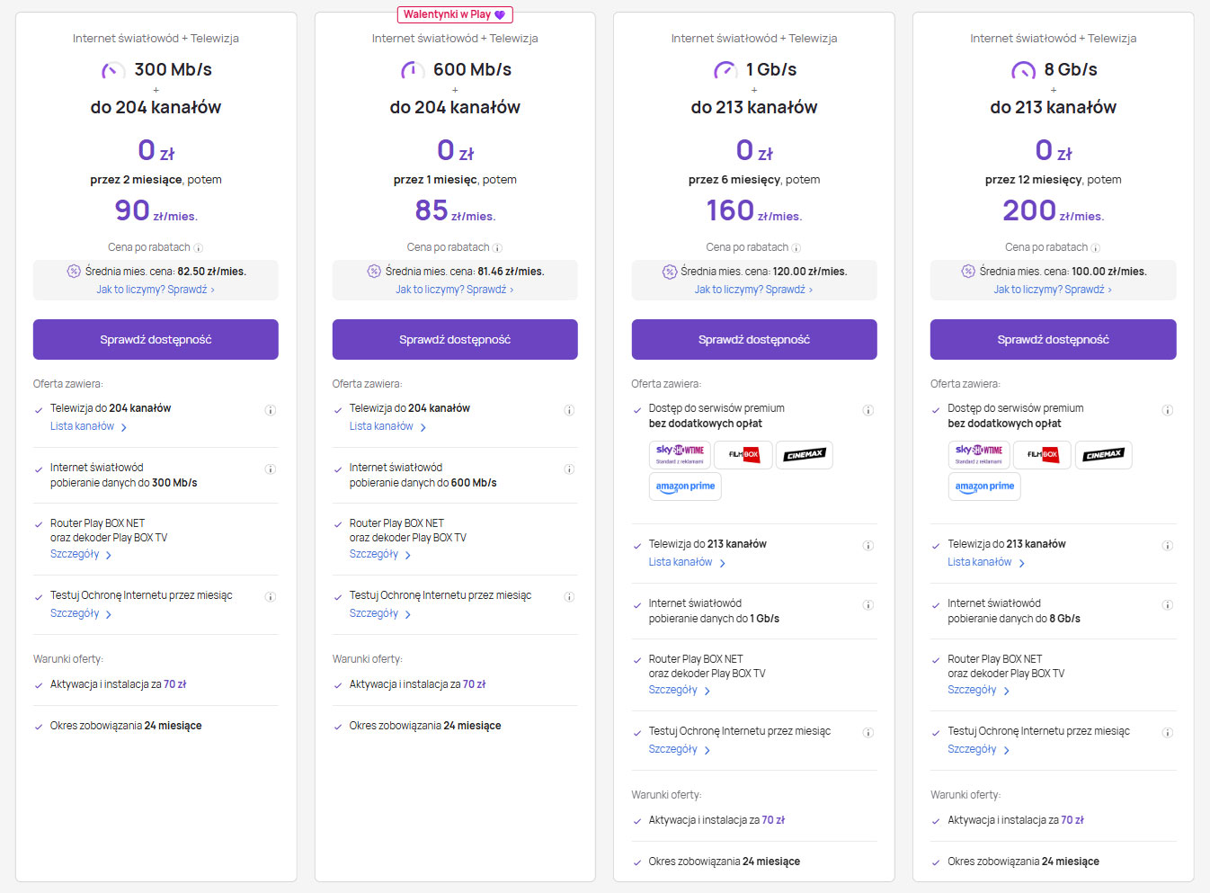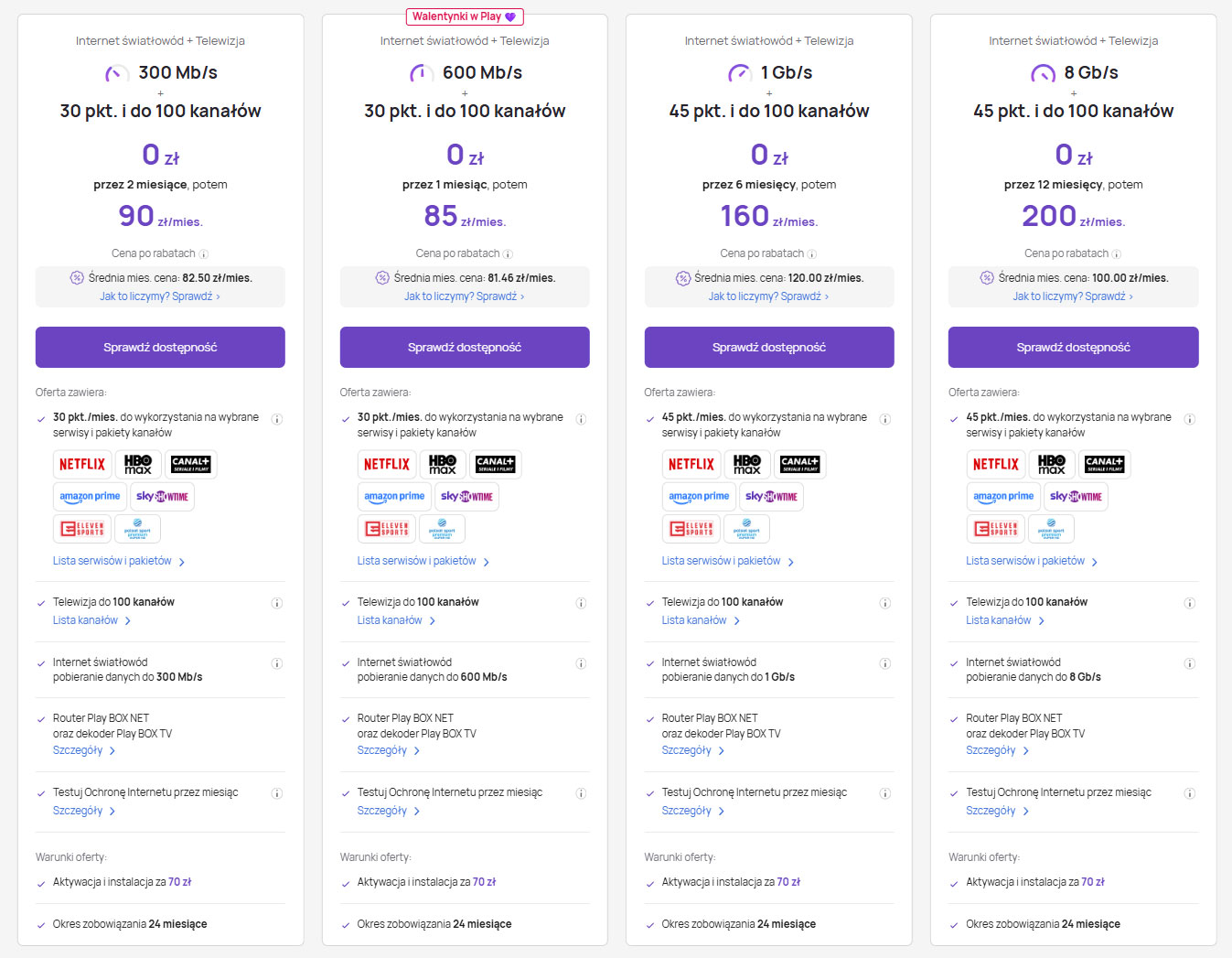 Play uruchomił walentynkową promocję na pakiet „Internet światłowód + Telewizja”, w której promuje wariant 600 Mb/s. Zestaw z telewizją do 100 kanałów i pulą 30 punktów na wybrane serwisy i pakiety kosztuje 0 zł przez pierwszy miesiąc, a potem 85 zł miesięcznie po rabatach.