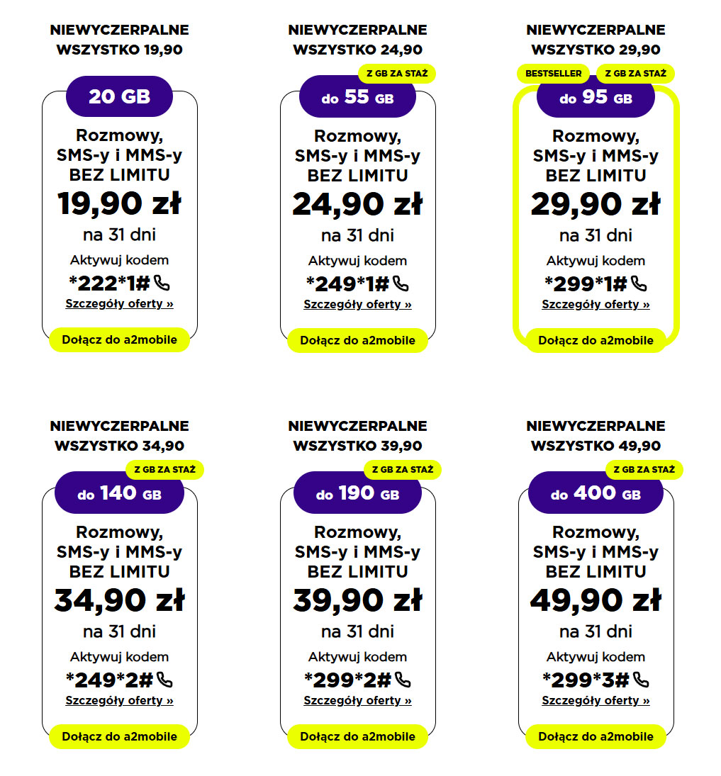 a2mobile promuje również pakiety Niewyczerpalne Wszystko w modelu subskrypcyjnym. Klienci wybierający tę formę mogą skorzystać z internetu bez limitu danych i bez ograniczeń prędkości przez określony czas, zależny od wybranego wariantu. W pakiecie za 24,90 zł nielimitowany internet dostępny jest przez 2 miesiące, w opcji za 29,90 zł przez 4 miesiące, w wariancie za 34,90 zł przez 6 miesięcy, przy 39,90 zł przez 12 miesięcy, a w najwyższym planie za 49,90 zł nawet przez 24 miesiące.