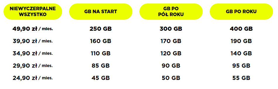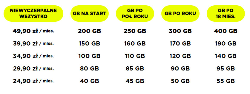 Po zmianach pakiet Niewyczerpalne Wszystko za 19,90 zł oferuje 20 GB zamiast 15 GB. W wariancie za 24,90 zł klienci otrzymują teraz 40 GB zamiast 35 GB. Pakiet za 29,90 zł oferuje teraz 80 GB zamiast 50 GB, opcja za 34,90 zł z 70 do 100 GB, a wariant za 39,90 zł ze 100 do 150 GB. Najwyższy pakiet za 49,90 zł zapewnia obecnie 200 GB zamiast 150 GB. We wszystkich przypadkach użytkownicy dostają również nielimitowane rozmowy, SMS-y i MMS-y przez 31 dni.
