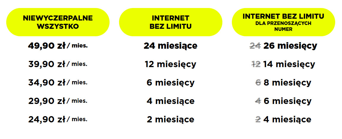 Jeszcze więcej zyskają osoby przenoszące numer z innej sieci. W ich przypadku okres dostępu do internetu bez limitu zostaje wydłużony o dodatkowe 2 miesiące. Oznacza to odpowiednio 4 miesiące w pakiecie za 24,90 zł, 6 miesięcy przy 29,90 zł, 8 miesięcy przy 34,90 zł, 14 miesięcy przy 39,90 zł oraz 26 miesięcy w wariancie za 49,90 zł.