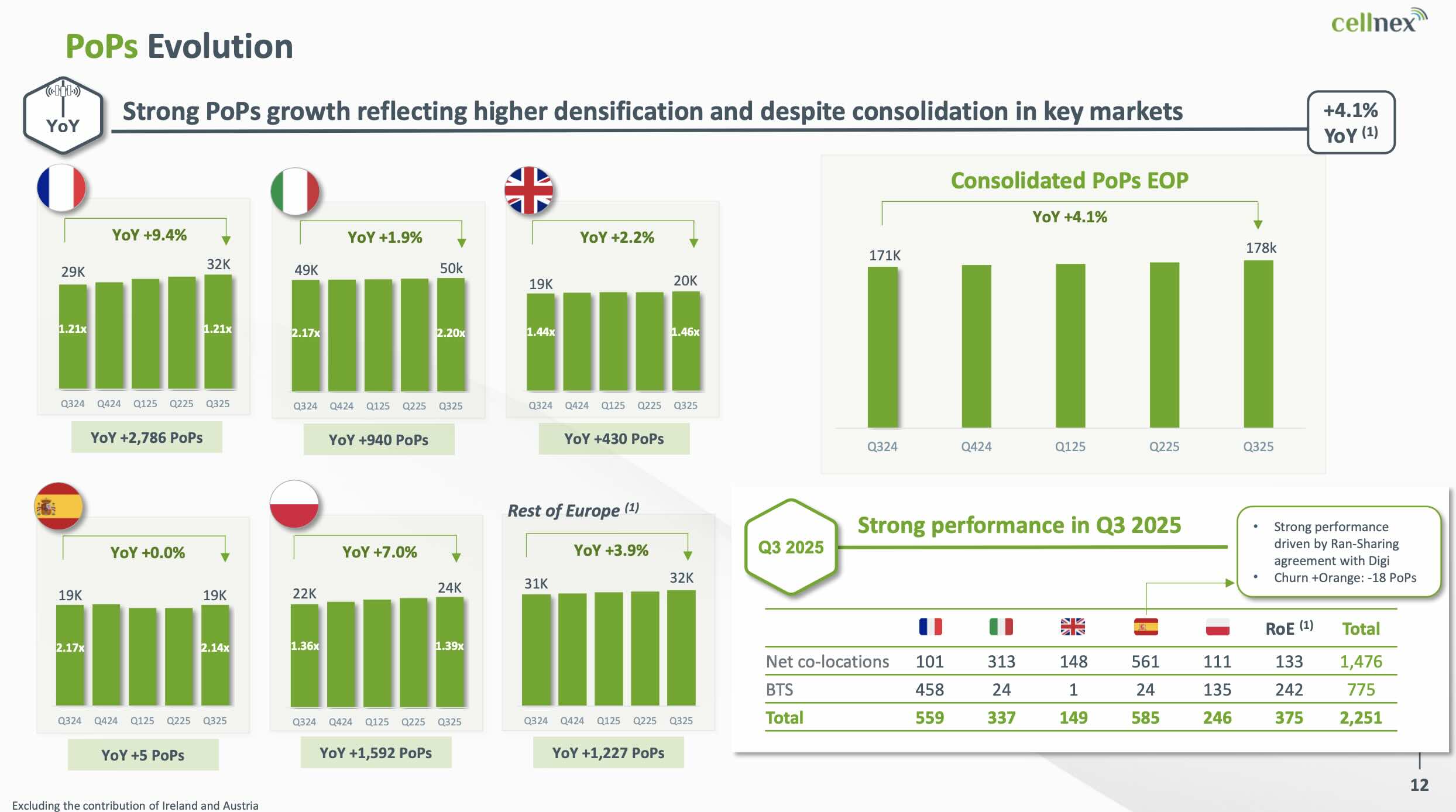 Cellnex odnotował 4,1% wzrost rok do roku w punktach obecności (PoP). Wzrost był szczególnie znaczący w Hiszpanii – napędzany umową Ran-Sharing z Digi – oraz dodatkowo podkreślony dodaniem 2 786 PoP we Francji i 1 592 w Polsce (głównie nadajniki sieci PLAY).