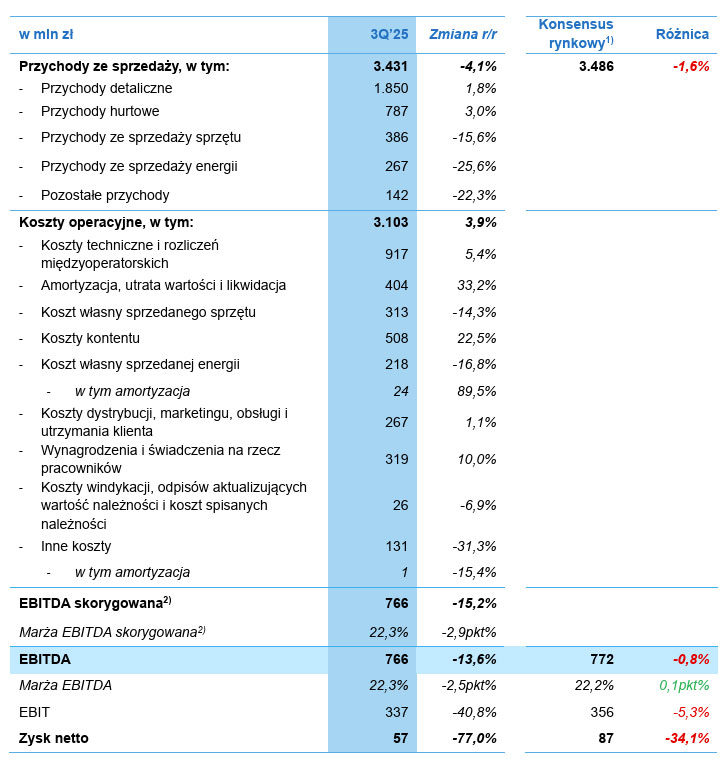 Przychody Grupy wyniosły 3,431 mld zł, co oznacza spadek o 4,1% rok do roku. Na dynamikę przychodów najsilniej wpłynęło załamanie przychodów ze sprzedaży energii – minus 92 mln zł, czyli 25,6% rok do roku. Wynikało to z niższego wolumenu produkcji energii z biomasy (remont jednego z kotłów) oraz niższych cen energii wobec wysokiej bazy z poprzedniego roku. Dodatkowo spadły przychody ze sprzedaży sprzętu o 71 mln zł (niższy wolumen). Częściowo te negatywne efekty zrównoważył wzrost przychodów detalicznych od klientów indywidualnych i biznesowych o 33 mln zł (dobre wyniki w usługach mobilnych i multiplay), a także wyższe przychody hurtowe o 23 mln zł, głównie z roamingu. Pozostałe przychody ze sprzedaży były niższe o 41 mln zł – w III kwartale 2025 r. nie było sprzedaży autobusów wodorowych, a aktywność na rynku fotowoltaicznym była niższa.