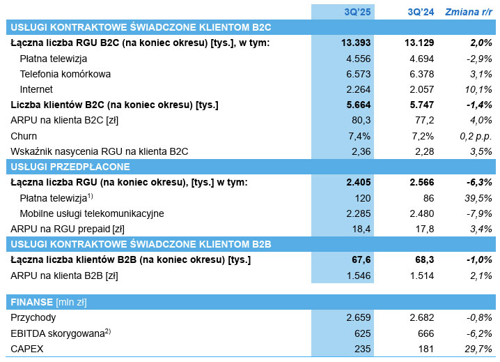 Łączna liczba usług kontraktowych B2C (RGU) wzrosła do 13,393 mln, co oznacza wzrost o 2% rok do roku. Najszybciej rośnie internet – do 2,264 mln RGU (wzrost o 207 tys., czyli 10,1% rok do roku). Telefonia komórkowa osiągnęła 6,573 mln RGU, o 195 tys. więcej niż rok wcześniej (wzrost 3,1%). W dół schodzi płatna telewizja – do 4,556 mln usług, czyli o 2,9% mniej rok do roku, co wynika z kurczącego się segmentu satelitarnego. Częściowo rekompensuje to rosnąca popularność usług IPTV/OTT.