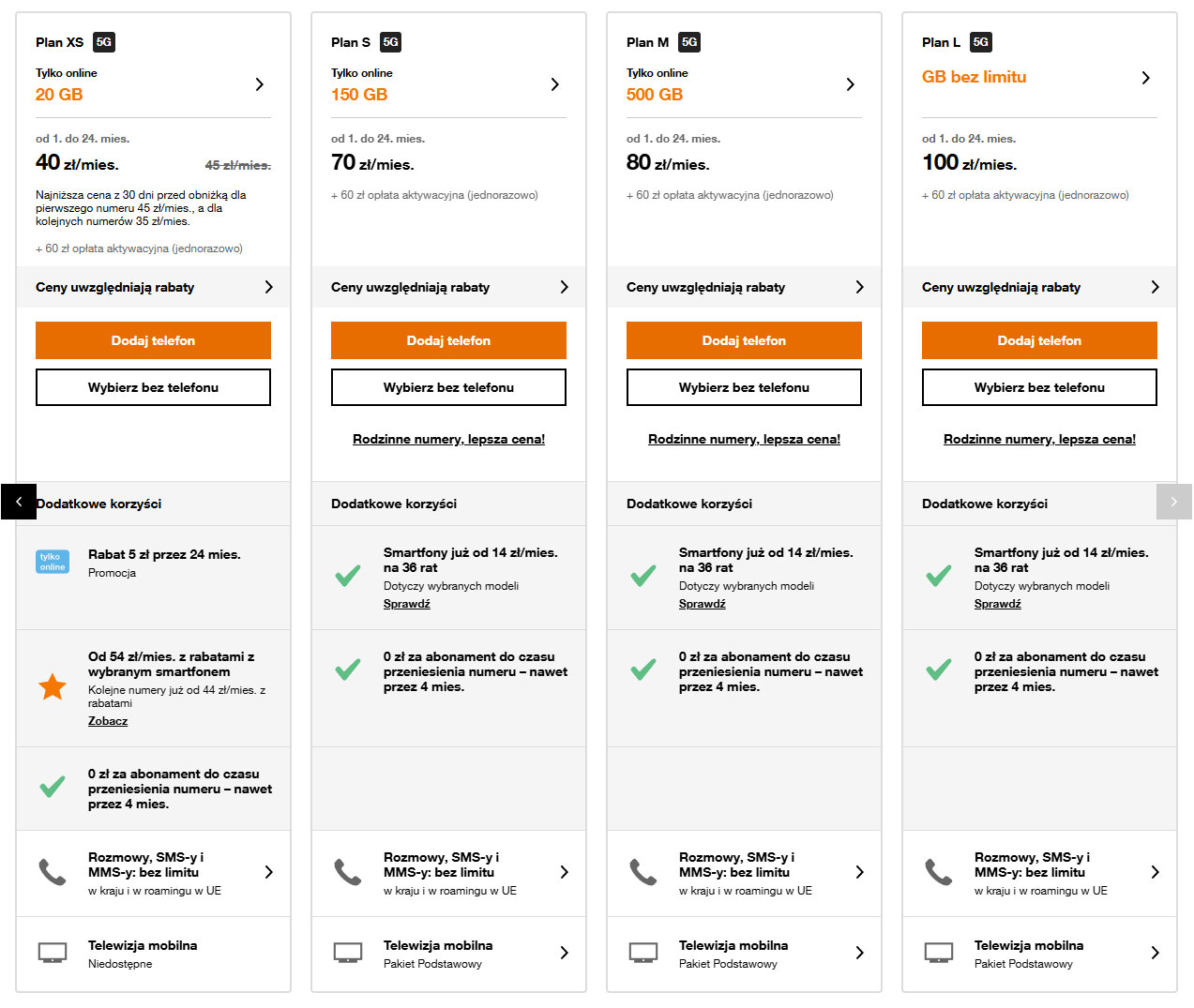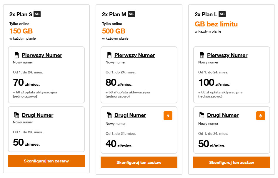 Orange utrzymuje też rabaty przy dokupieniu kolejnych numerów. Standardowo operator przyznaje 20 zł zniżki na następny numer, ale w planach M i L pojawia się dodatkowy bonus: 50-procentowy rabat na drugi numer przez cały okres umowy. Co ważne, zniżka może zostać zachowana również po zakończeniu kontraktu.