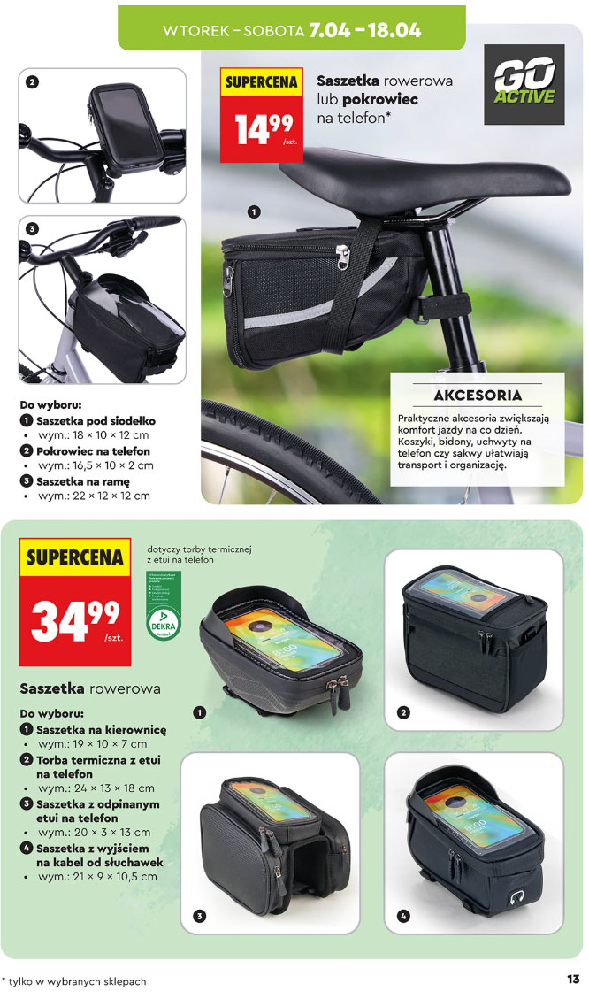 W promocji za 14,99 zł dostępne są również saszetki rowerowe lub pokrowce na telefon. Do wyboru są modele pod siodełko, na ramę oraz pokrowiec na telefon. Dodatkowo za 34,99 zł za sztukę Biedronka oferuje saszetki rowerowe, w tym saszetkę na kierownicę, torbę termiczną z etui na telefon, saszetkę z odpinanym etui na telefon oraz model z wyjściem na kabel słuchawkowy.