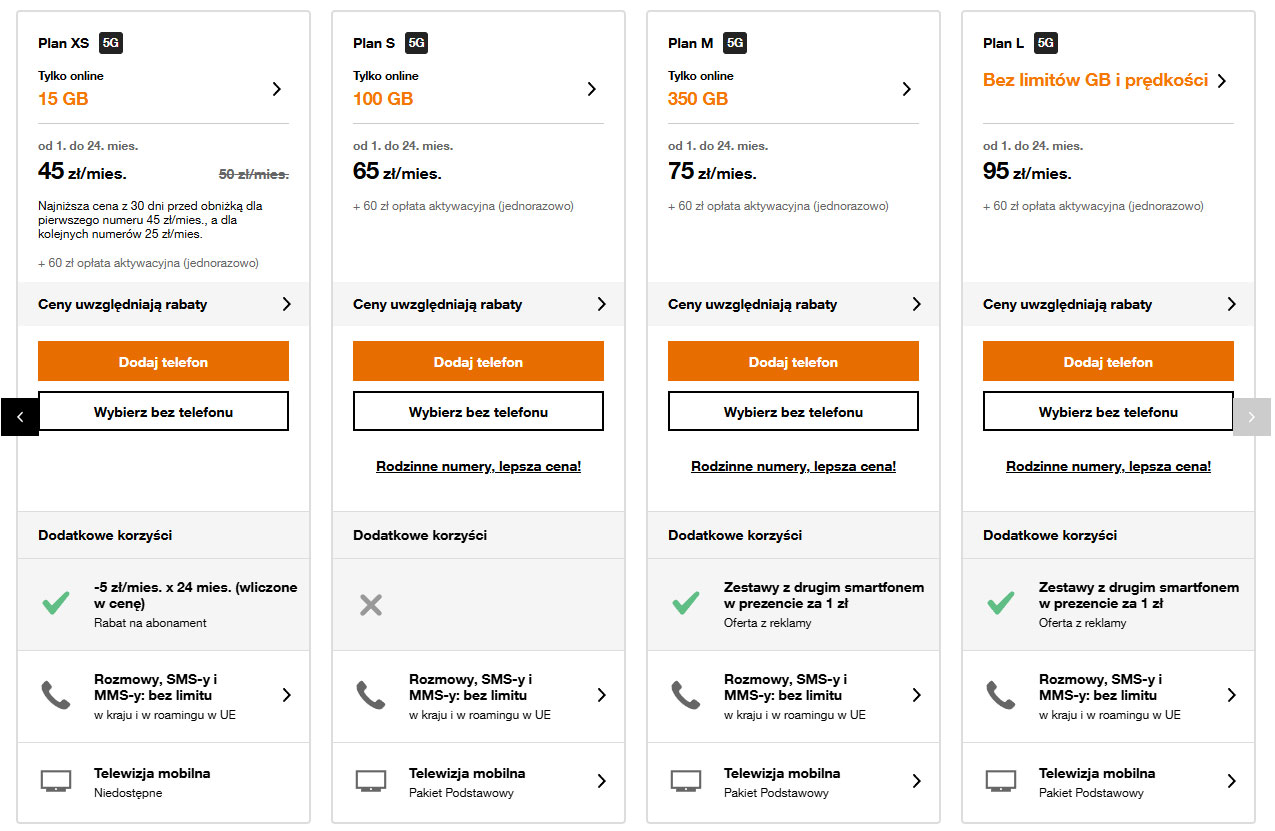 Ceny Planów XS, S, M, L uwzględniają rabat dla użytkowników Mój Orange za e-fakturę, odbierany co miesiąc w Mój Orange (-5 zł/mies.).