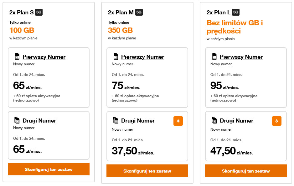 Decydując się na dwa numery w Orange, za drugi płacimy połowę ceny. Przekłada się to na 75 zł + 37,50 zł miesięcznie dla dwóch Planów M lub 95 zł + 47,50 zł miesięcznie dla dwóch Planów L.