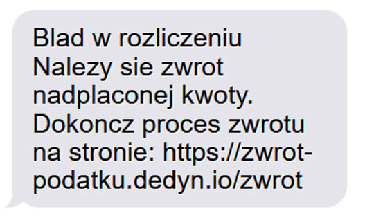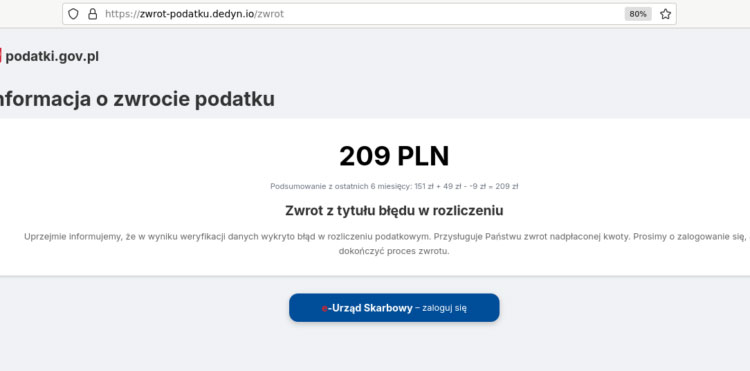 Ofiary dostają SMS-y z linkiem prowadzącym na fałszywą stronę w rodzaju zwrot-podatku.dedyn.io. Choć na ekranie widnieje herb RP i napis „podatki.gov.pl”, to nie jest serwis rządowy. Usługi państwowe działają wyłącznie w domenie gov.pl, a wszystko poza nią to próba oszustwa.